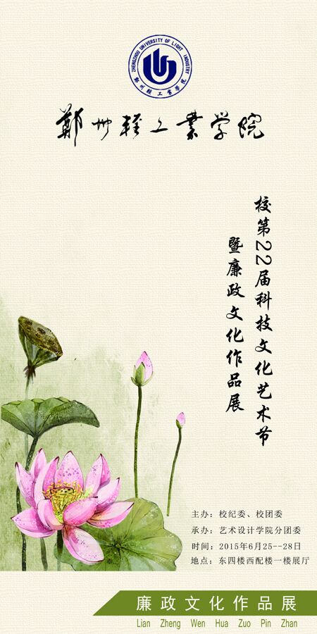 关于观看廉政文化作品展的通知关于观看廉政文化作品展的通知,欢迎全校师生到东四楼一楼展厅观看校科技文艺艺术节暨廉政文化作品展,展出时间:2015年6月25-28日展出地点:东四楼一楼展厅展出内容:招贴画、书法、摄影、微电影、动漫等温馨提示:请在门口扫描二维码进行投票,每人限投5幅作品。