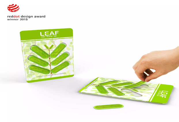 绿叶-创可贴能够提示人们及时更换创可贴,它表面使用特殊的变色材料,当感应人皮肤表面的温度时开始逐渐发生变色反应。当创可贴使用超过3天时变成“枯萎”颜色,以提示人们及时更换创可贴,避免伤口感染。