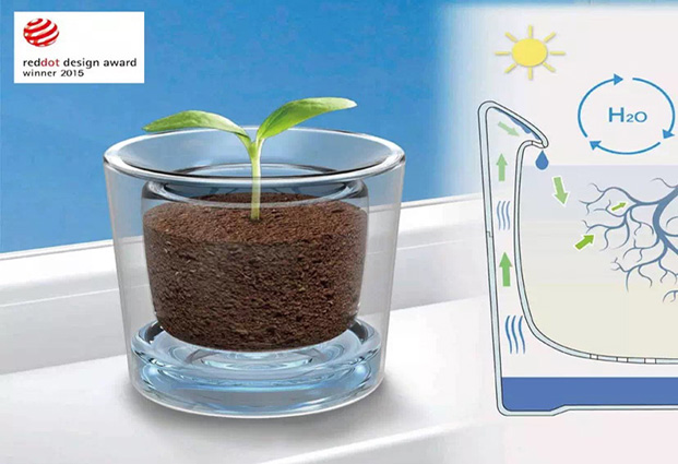 设计说明:这是一个能将浇花后未被完全吸收的水通过蒸发作用进行循环利用的花盆,普通花盆浇花后未被吸收的水会漏出造成浪费,该产品通过简单的内部结构将多余的水通过阳光的蒸发再回到土壤中,达到循环利用的目的。该花盆使用了双层中空的结构将浇花后多余的水存放在花盆内壁,经过阳光的照射和温差的过程,水在花盆内被蒸发,进而在内壁上方的斜面凝结成小水珠,最后通过斜面落回土壤,形成循环灌溉。