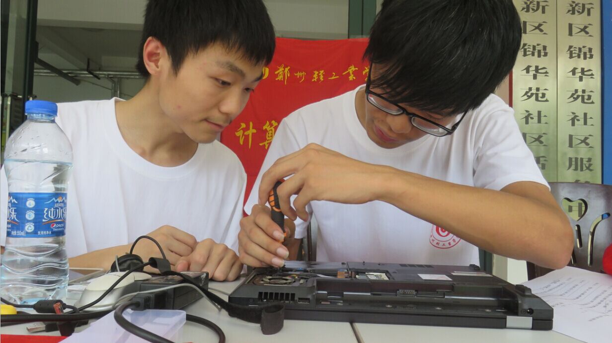 由计算机与通信工程学院组建的电脑义务维修服务队在郑州市高新区锦华苑社区开展暑假义务维修活动。