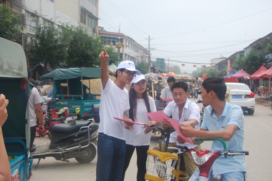 在汝南县老君庙镇,小分队在工作人员的帮助下,在人口流动较大的聚集点进行搭建工作,之后播放乡镇信息化和“互联网+”视频,发放宣传资料,为村民们讲述信息时代农业机械化、信息化的管理方式及“互联网+”为乡镇农村带来的农产品销售信息化等增收致富的方式,同时,实践队员先后发放大量问卷调查,积极了解当前乡镇的信息化程度,“互联网+”的普及程度及农民们的真正需求。之后,队员们赶赴君思缘种猪场和老君庙种植场,在了解到两场地各自的情况后,为村民详细介绍了网络信息化在种猪场内的应用方向、增收致富的“互联网+”模式和“祥云航空植保无人机”。
