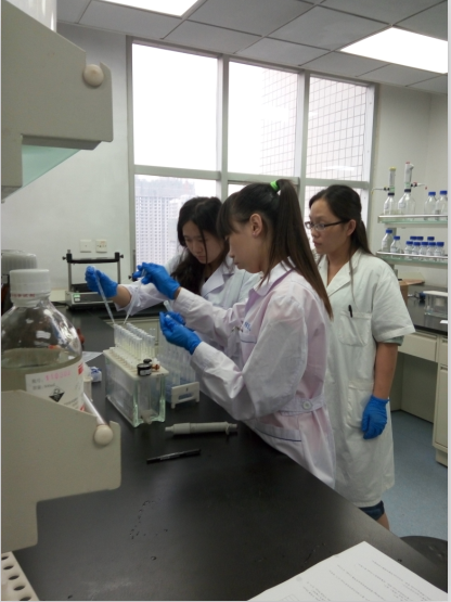 在海瑞正检测技术有限公司,队员们检测食品与复合混肥料,检测项目包括钠、钾、氮、镁、磷、铁、钙、锌以及重金属含量。在工作人员的指导下,队员们对样品进行处理,经测量得到实验数据,并分别与空白样品及质控样品测得的实验数据进行比对,便可得到目标物的含量后,判断样品是否符合生产要求。