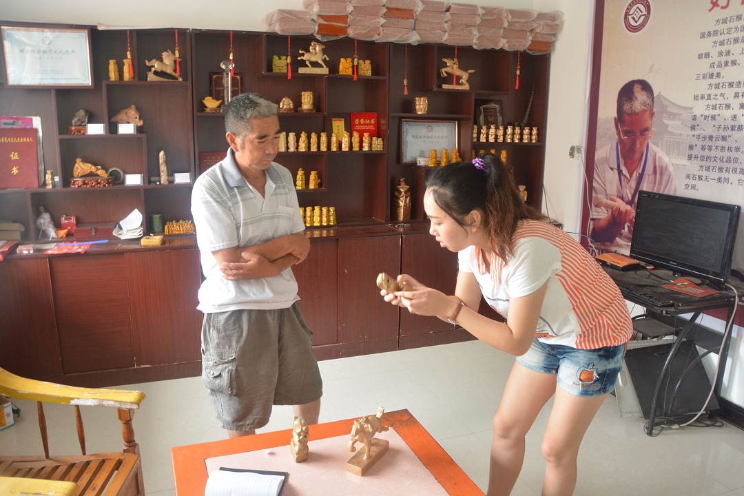 小分队首先来到了南阳市拓宝玉器有限公司,在工艺大师仵孟超先生的带领下,参观了工作室和玉器生产加工车间,观察了玉器加工的各个环节,详细了解了有关玉雕工艺、玉器文化内涵及玉雕工艺传承的知识等玉石行业的相关情况,并采集了大量玉器图片。次日,小分队来到南阳烙画厂,欣赏了形式多样、内容丰富的烙画作品,并在该厂负责人朱主任的陪同讲解下了解了烙画的相关知识和部分作品的生产程序以及烙画厂的经营与发展问题,就非物质文化遗产所面临的问题与其探讨,并提出相关建议。最后,小分队来到方城石猴文化传承人王国庆先生家中,据其介绍,了解了方城石猴色彩强烈鲜明、风格独具神韵、寓意喜庆吉祥的特点,是研究中原民俗文化的“活化石”。活动在队员们增长了非物质文化遗产方面的知识,开拓了自身眼界,提升了自身文化素养中落下帷幕。