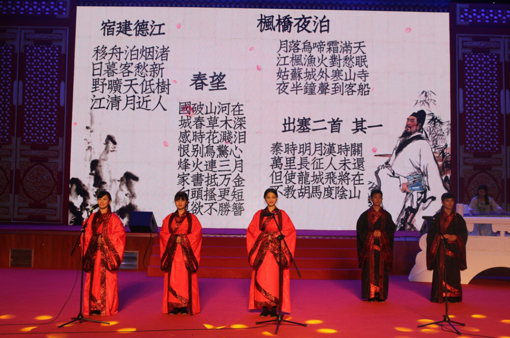 小分队到达目的地后,在工作人员的带领下,队员们熟悉了舞台布局以及吟诵流程,为比赛的开始做好了充分的准备。在“中华吟诵周”开幕式上,我校陈江风院长作为河南省吟诵学会的副会长对河南省吟诵学会近几年的工作进行介绍,接下来便是我校吟诵社成员代表进行传统诗词的吟诵表演,吟诵在平仄不同的四首格律诗,男女声的巧妙搭配,再加上传统华调的唯美声中顺利举行。通过此次活动小分队成员们对古典诗词吟诵有更深的了解,能更好地承担起继承与发扬我国传统文化之重任,深刻意识到中华经典诗文在我国民族文化中的重要性。