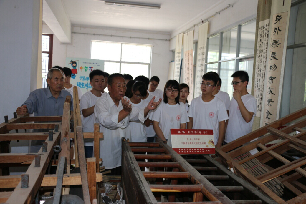 实践小分队一行8人先后对平舆县古槐镇千年古槐,陈蕃公园进行实地考察。听取了平舆县车舆文化研究会副会长、文博副研究员张耀征先生,副会长兼秘书长刘德升先生以及85岁高龄的常务副会长闫振洲先生关于对车舆文化历史起源的介绍和当前发展情况。经介绍,了解了为抢救、保护和研究这一非物质文化遗产,平舆人从最初的资金筹备到后来车舆文化的建设所面临的艰难险阻。经过努力,太平车在2007年和2008年,分别成功申报为河南省省级非物质文化遗产、国家级非物质文化遗产,经刘德升先生及闫振洲先生的介绍下队员们了解了太平车的种类、工艺、作用及部分使用方法。活动在队员们学习了中华民族传统文化精神中圆满结束。