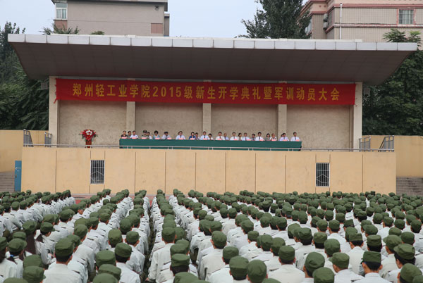 99上午,郑州轻工业学院2015级新生开学典礼暨军训动员大会分别在东风校区和科学校区隆重举行。校领导石恒真、赵卫东、张胜利、窦效民、尚宝平、龚毅、陈江风、吕彦力、安士伟、毛多斌、王新杰、李世瑛,承训部队首长出席并在主席台前排就座。各院(系、部)和相关职能部门负责同志、承训部队教官和2015级新同学参加了典礼暨动员大会。大会由副校长安士伟主持。