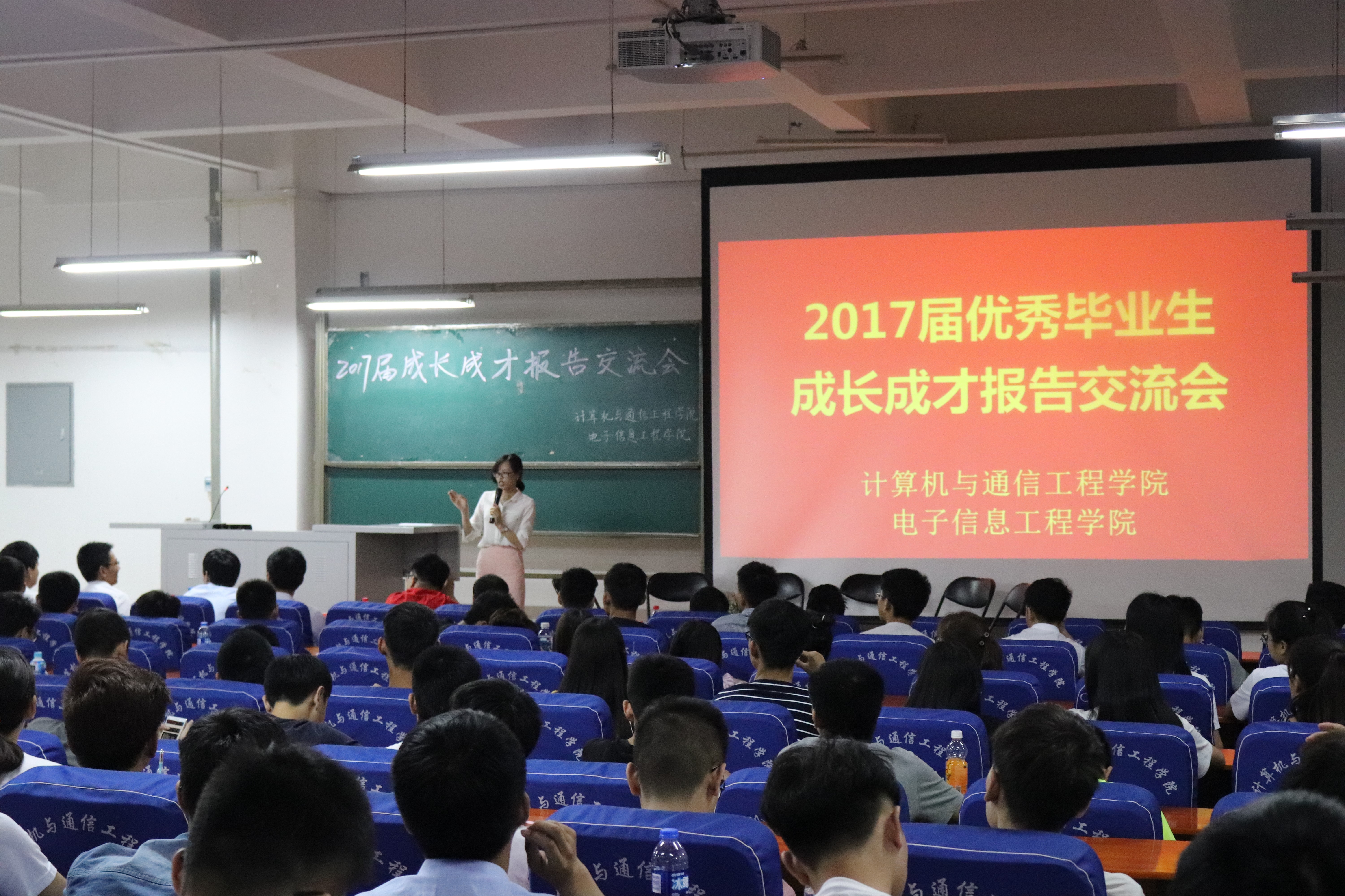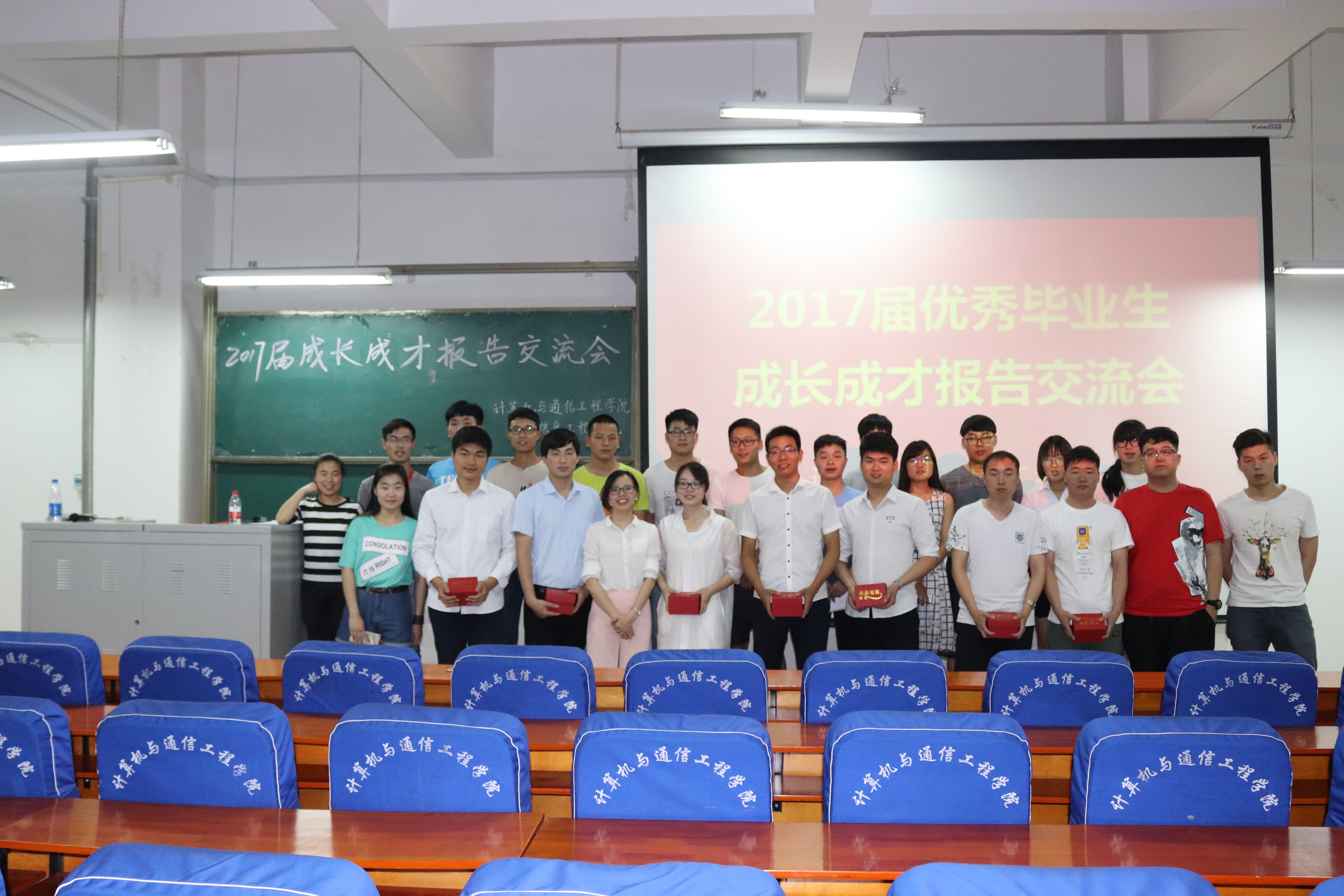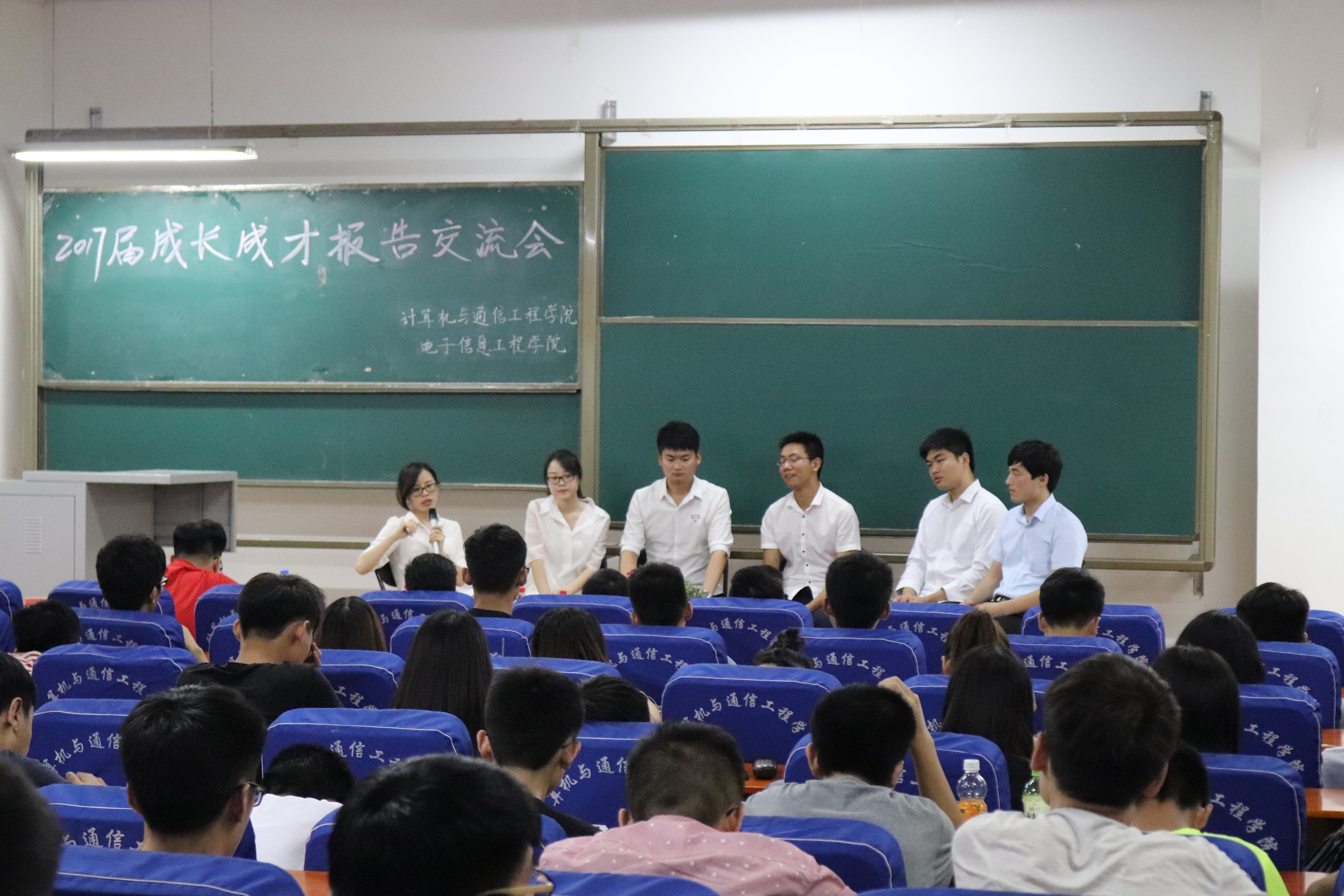 5月25日晚上19:30计算机与通信工程学院(电子信息工程学院)在计算机楼217举行了“2017届优秀毕业生成长成才报告交流会”。此次交流会邀请了2017届毕业生中在考研、考公务员、创业、求职等各方面表现突出的同学为主讲嘉宾,学院大一、大二、大三的部分学生代表参加了本次报告交流会,学院分团委书记沈高峰、学工办主任司丽娜,辅导员欧阳杜娟和艾怡静老师参加了大会,会议由欧阳杜娟主持。