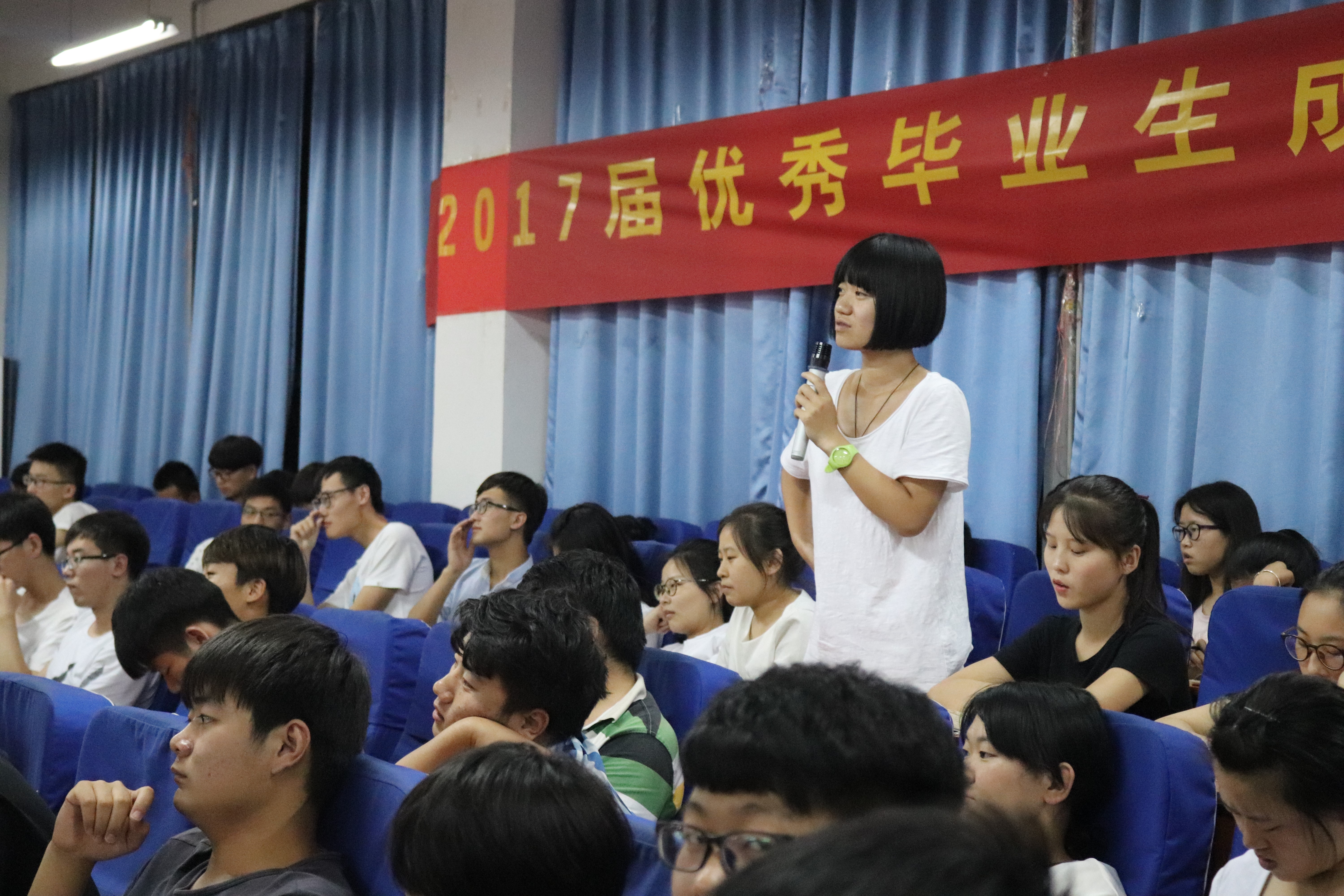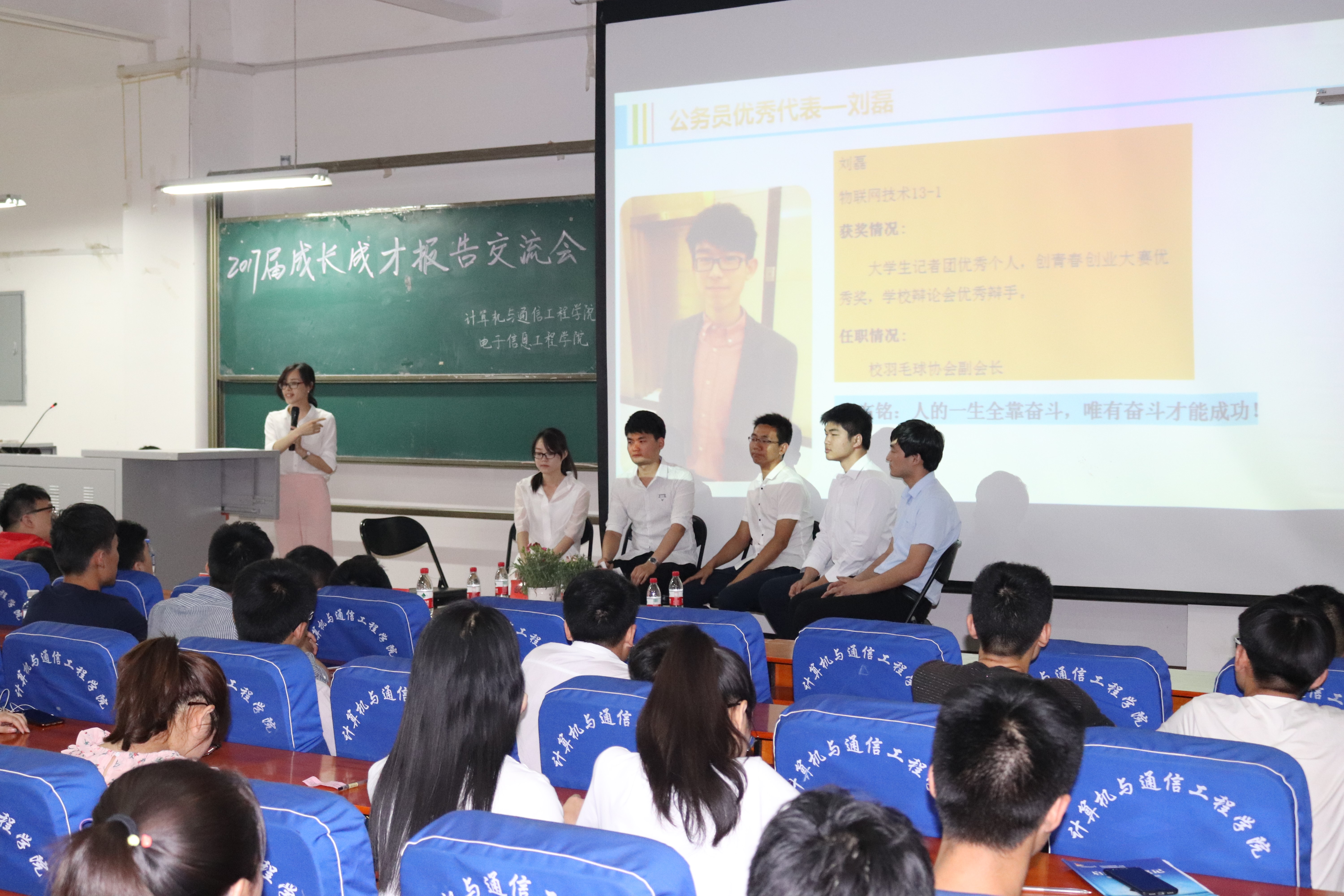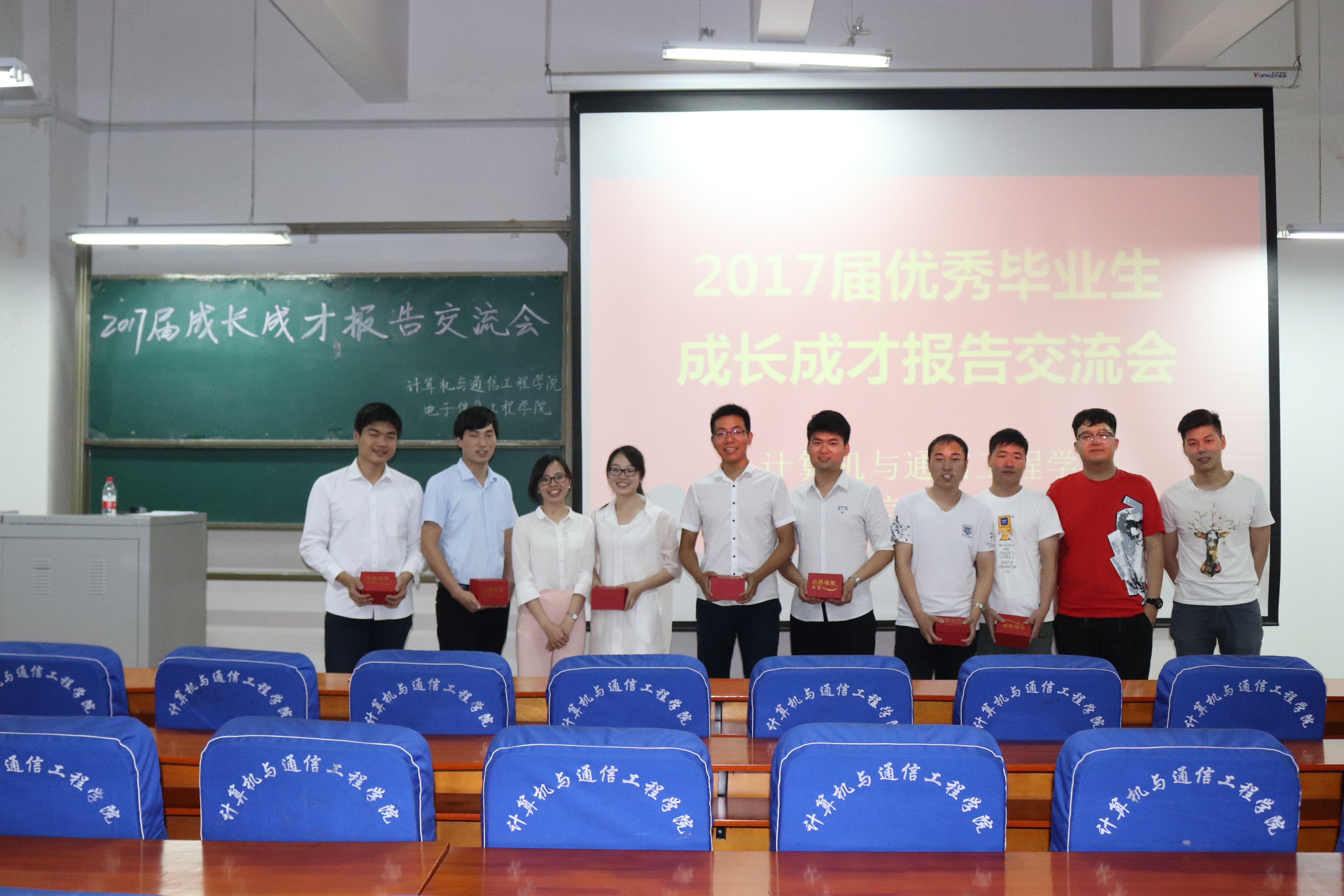 5月25日晚上19:30计算机与通信工程学院(电子信息工程学院)在计算机楼217举行了“2017届优秀毕业生成长成才报告交流会”。此次交流会邀请了2017届毕业生中在考研、考公务员、创业、求职等各方面表现突出的同学为主讲嘉宾,学院大一、大二、大三的部分学生代表参加了本次报告交流会,学院分团委书记沈高峰、学工办主任司丽娜,辅导员欧阳杜娟和艾怡静老师参加了大会,会议由欧阳杜娟主持。