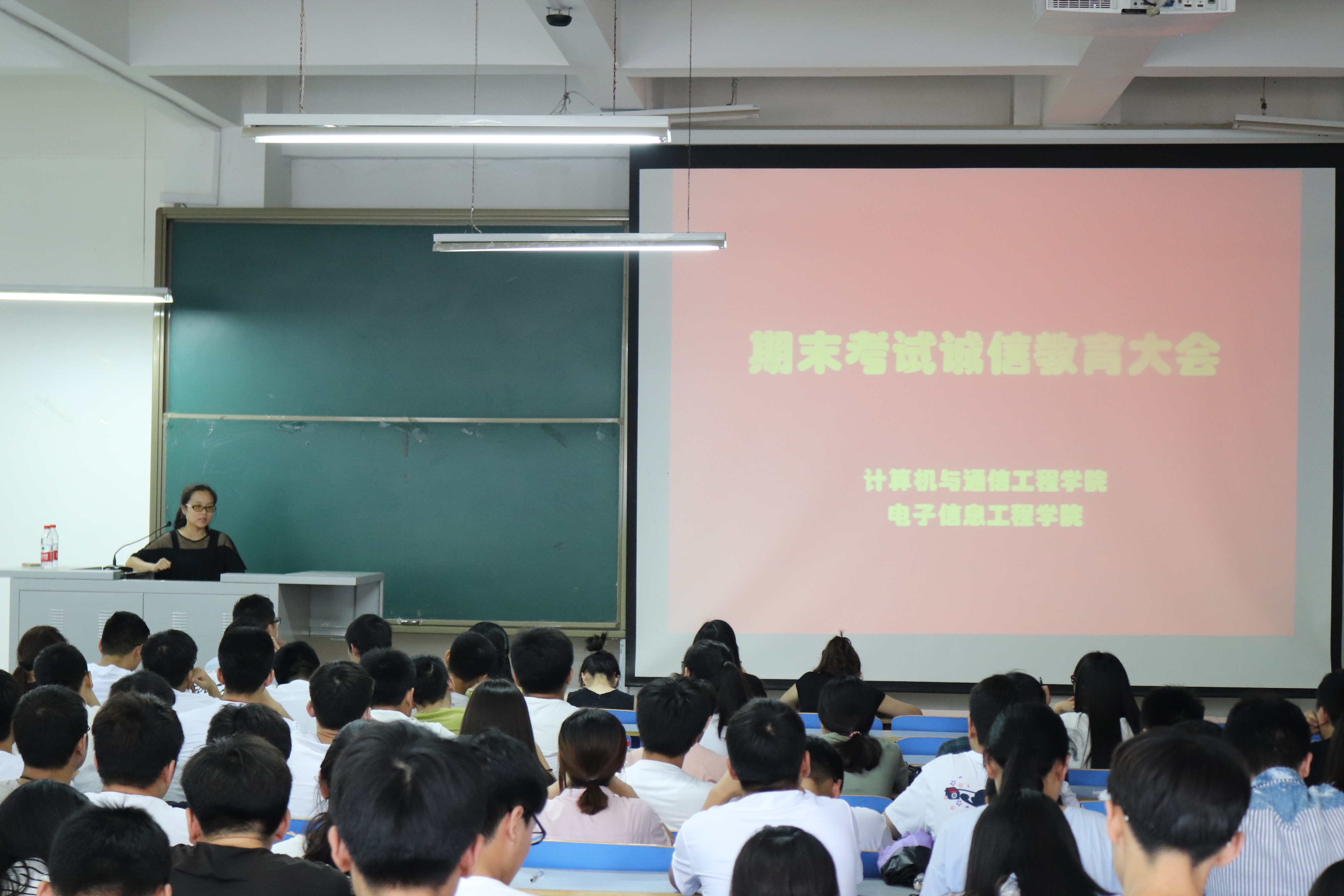 为进一步加强学院学风建设,严肃考风考纪,计算机与通信工程学院(电子信息工程学院)于6月27日下午13:00在计算机楼118举办期末考试诚信教育大会。分团委书记沈高峰,学工办主任司丽娜,专兼职辅导员、各班级主要干部近300人参与此次会议。