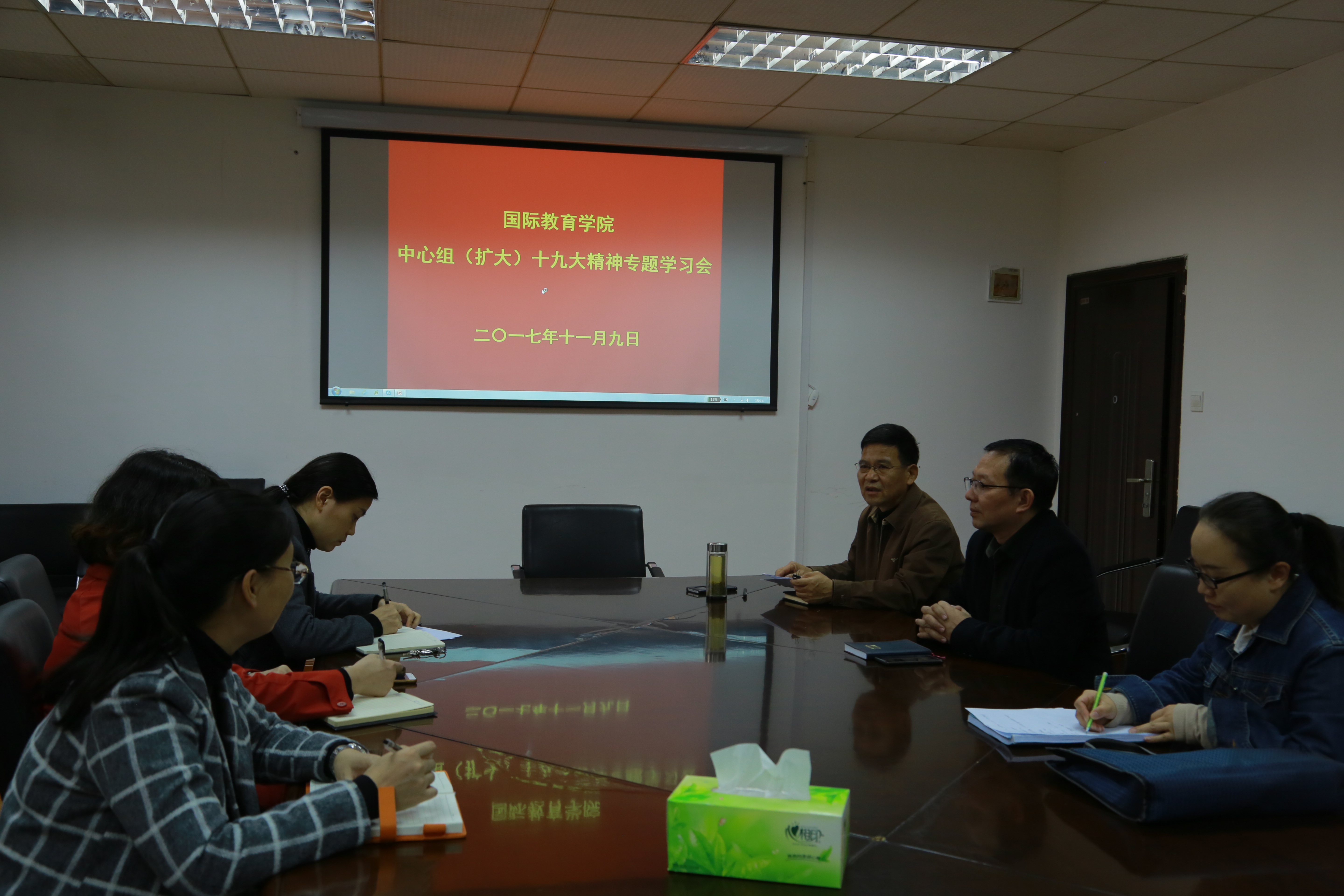 为深入推进党的十九大精神学习宣传贯彻工作,11月9日,国际教育学院在教二楼313会议室召开中心组(扩大)十九大精神专题学习会,学院党总支委员、各支部书记参加了学习会,学习会由党总支书记戚俊清主持。