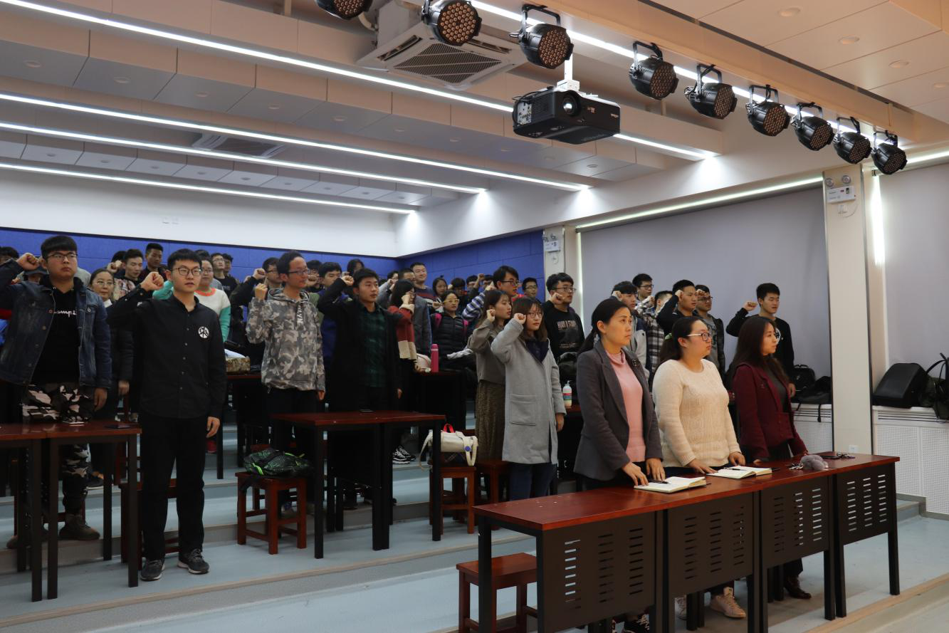 活动中同学们一起观看了一二·九学生爱国运动背景和《新时代》可视化解读习近平总书记十九大报告的视频。在一代一代热血爱国青年的不懈奋斗下,无论是历经沧桑还是风华正茂,都在用自己的热血为中国的崛起而奋斗着。各个入党积极分子代表通过“铭记历史,奋勇向前”的即兴演讲、“祖国啊,我亲爱的祖国”诗朗诵等形式表达着自己的爱国热情与要勇立潮头、筑梦不息的理想信念。学生党员代表孙逸天同学带领全体同学进行了“不忘初心跟党走,青春建功新时代”的宣誓,深刻表达“一百字青春誓言,一百万心声向党”的坚定决心。