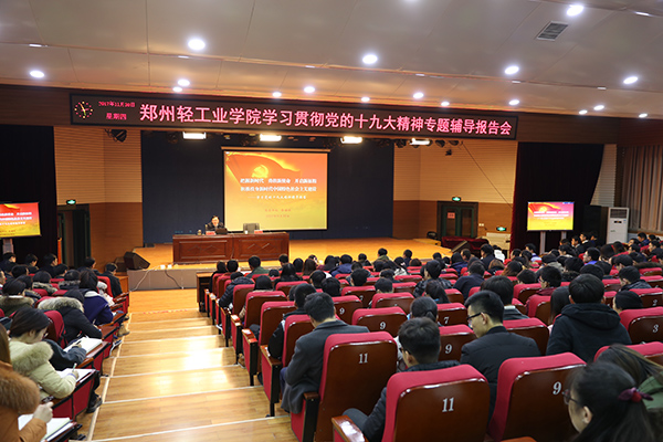 11月30日下午,党委书记俞海洛为学校师生作学习党的十九大精神辅导报告,各院系党总支副书记、专兼职辅导员、学生党员骨干、党员发展对象,以及相关职能部门工作人员聆听了辅导报告。报告会由党委副书记马英主持。