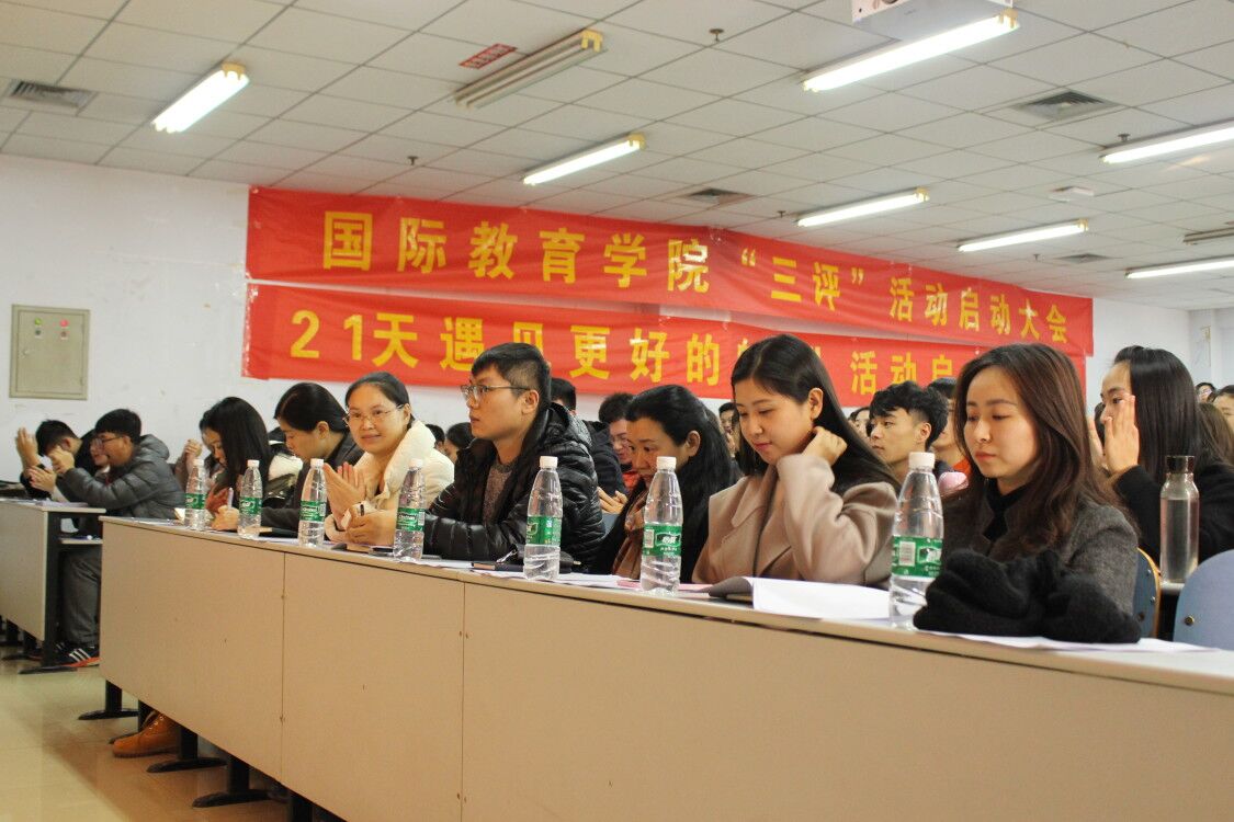为配合我院开展“三评”工作,国际教育学院学生会策划了“21天遇见更好的自己”系列活动。活动包括“学风养成计划”、“英语学习计划”、“生活习惯养成计划”,通过课堂、宿舍、“三早一晚”三方面的21天好习惯的坚持,帮助同学们提升精神面貌,加强自我约束和管理。活动获得了极高的反响,学生干部们纷纷表示要参与其中,带领同学们以更积极的姿态为学院建设助力。