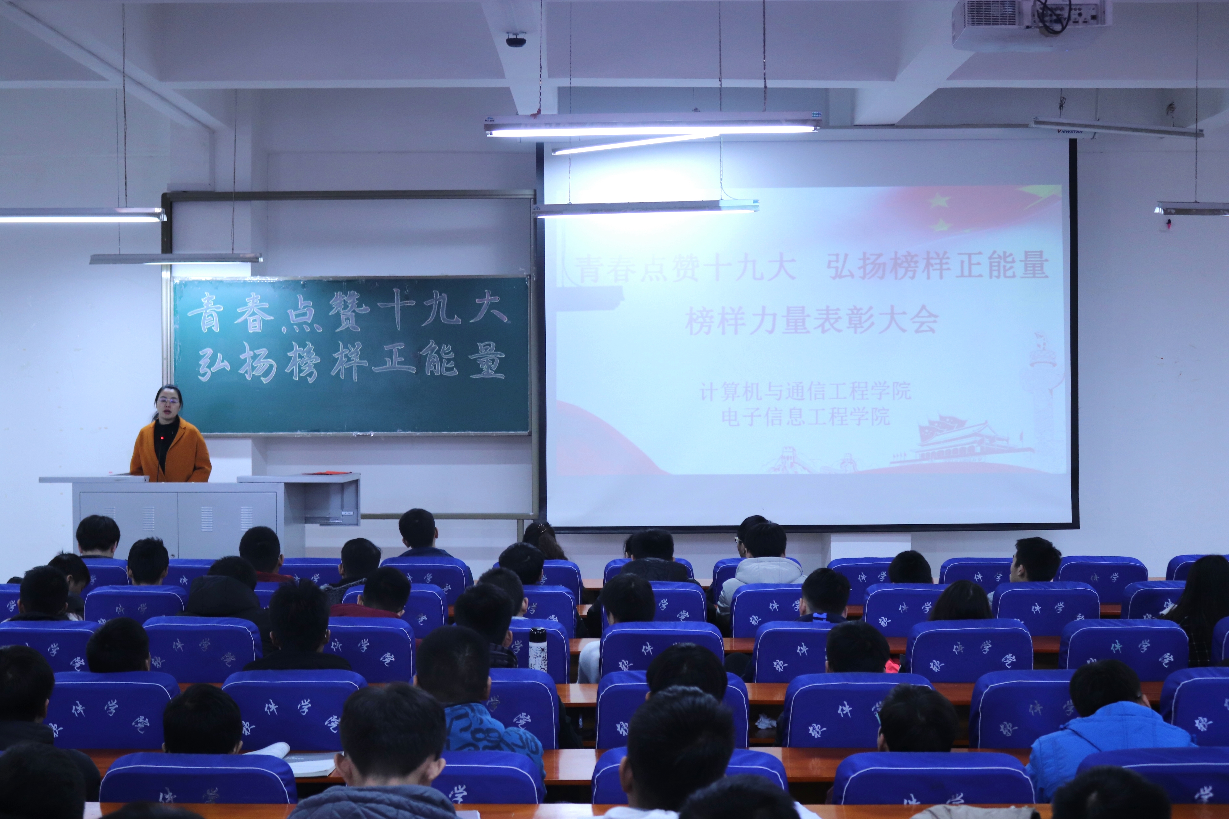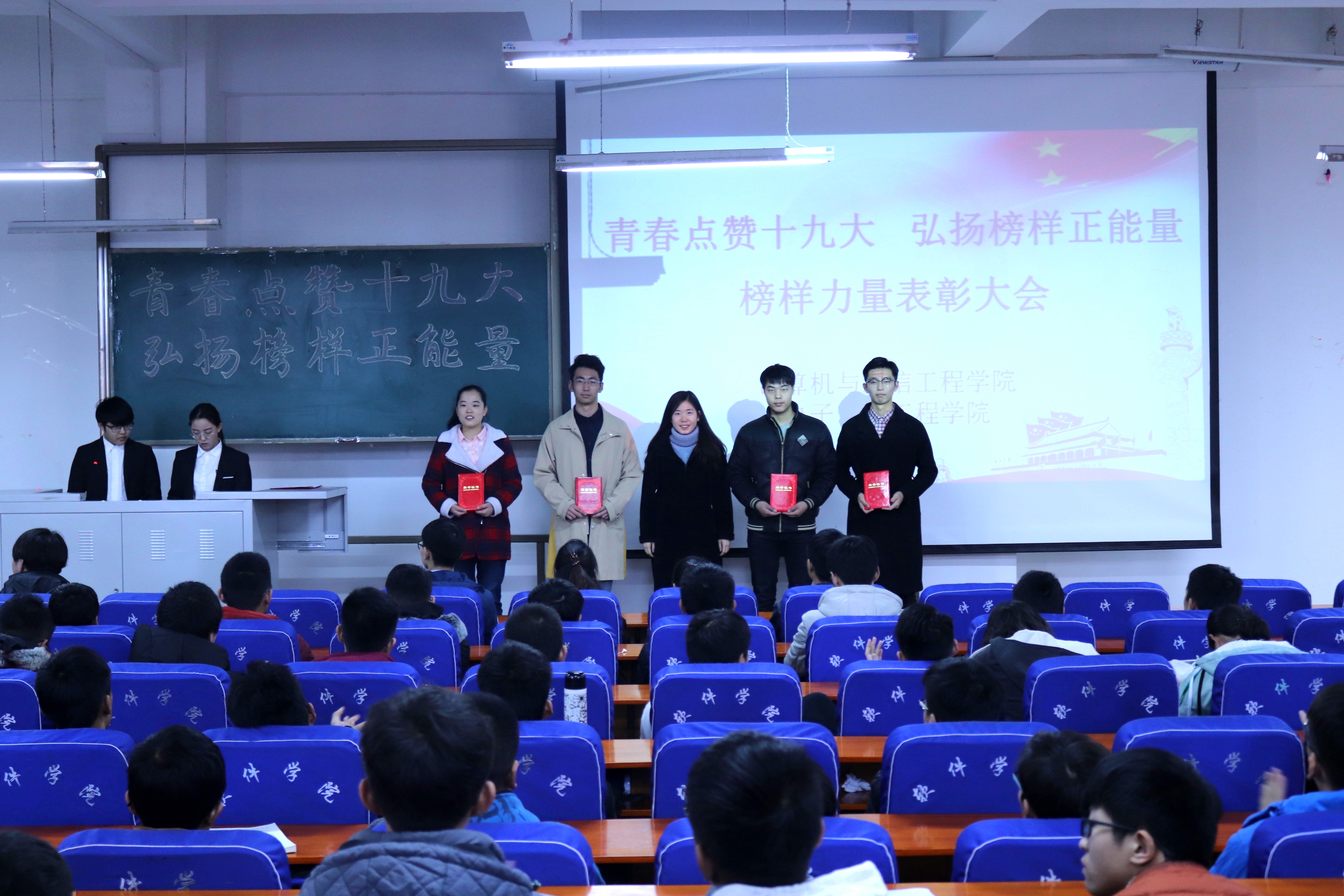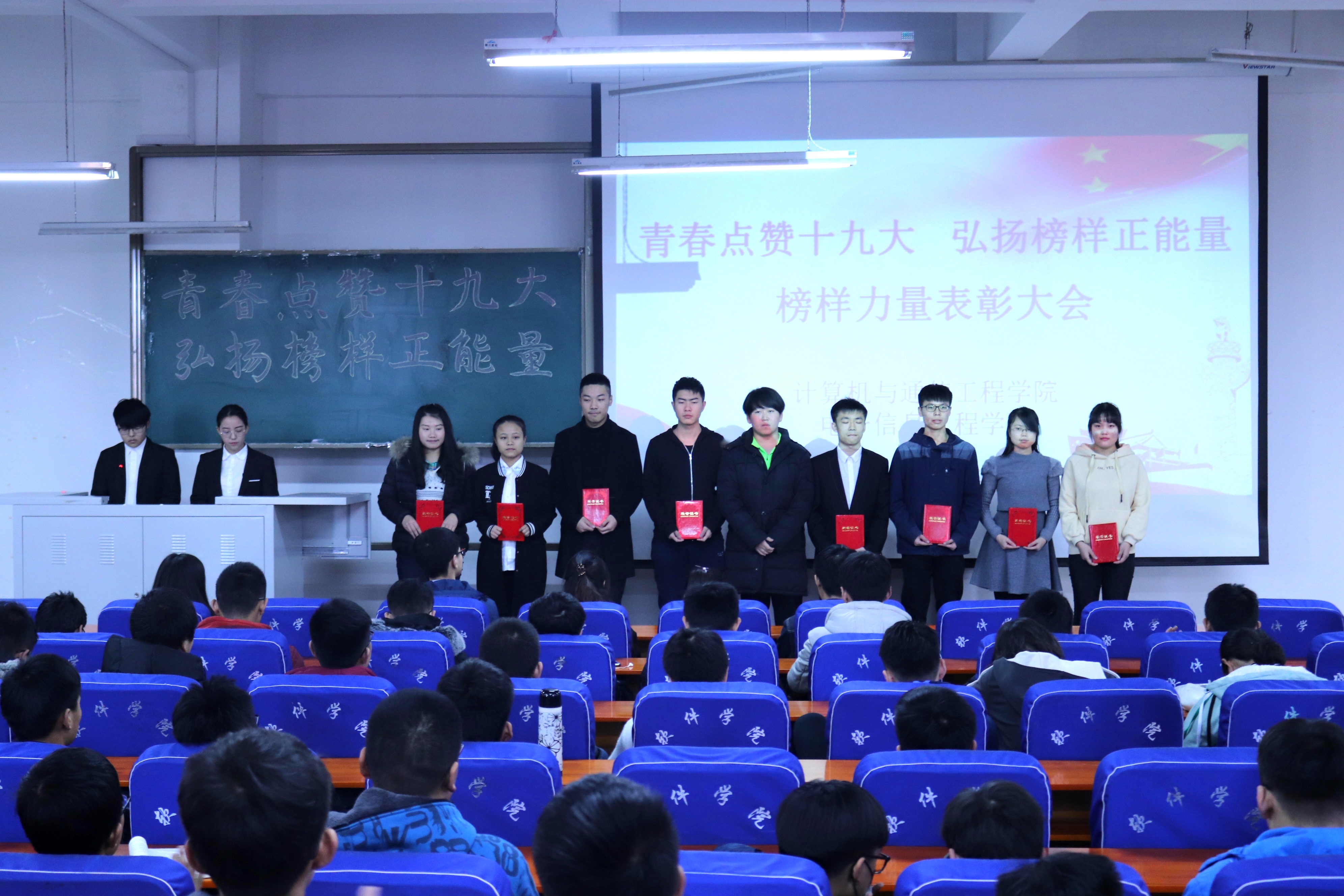 为进一步提升基层团支部活力,充分发挥大学生榜样作用,传递青春榜样正能量。计算机与通信工程学院(电子信息工程学院)于12月8日中午12点20在计算机楼219举办以“青春点赞十九大 弘扬榜样正能量”为主题的榜样力量表彰大会。辅导员孟牒老师、艾怡静老师、学院分团委全体成员、16级及17级学生代表共200余人参加了大会。