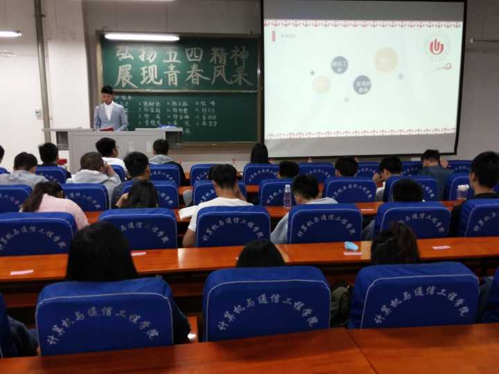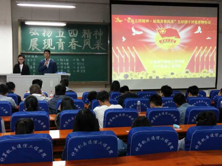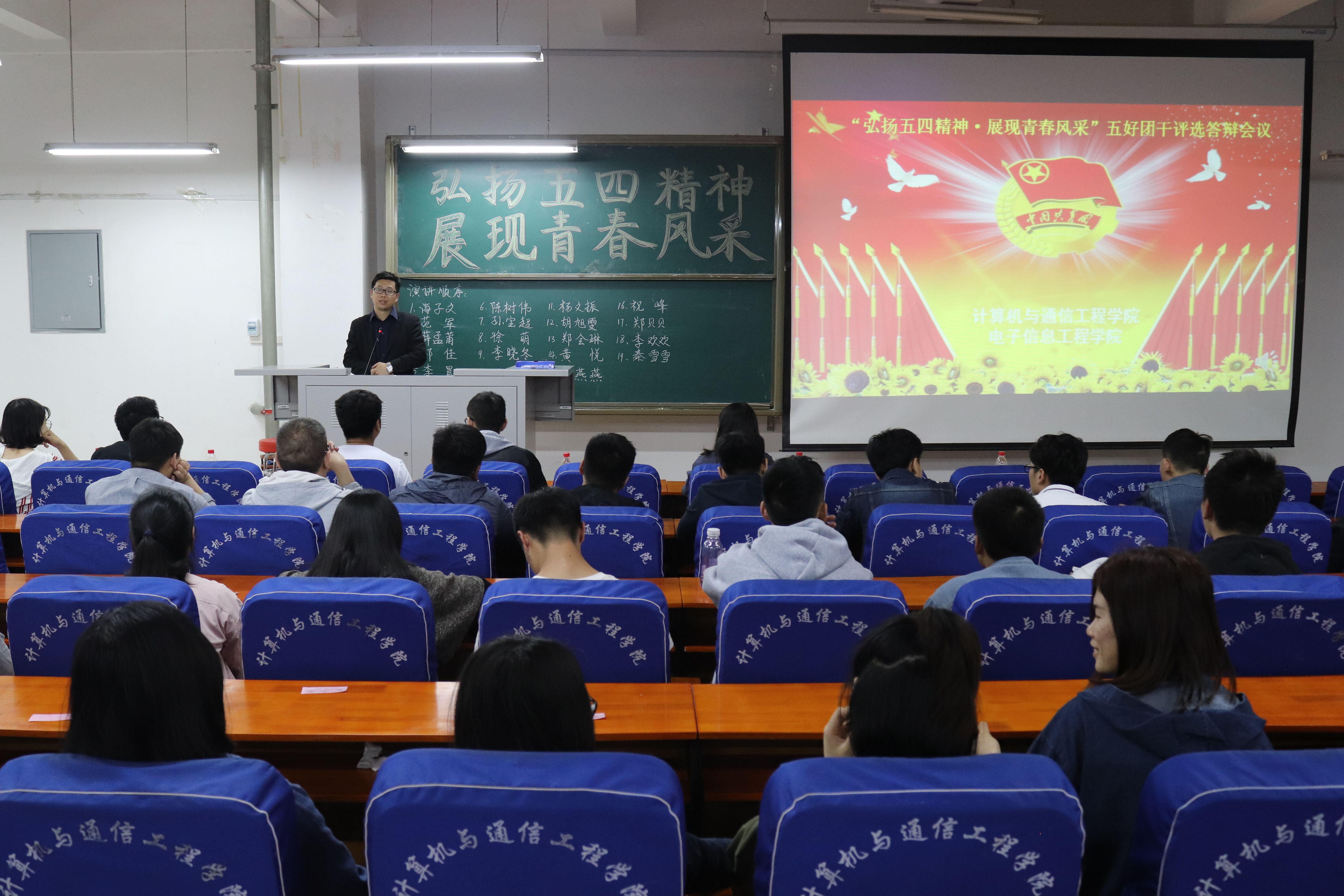 弘扬五四精神,展现青春风采“,4月11日晚上19:00,计算机与通信工程学院(电子信息工程学院)在计算机楼217、118举办“正学风 聚能量”学风建设之“弘扬五四精神,展现青春风采”五好优秀团员、五好优秀团干、五好先进团支部评选演讲答辩会。学院分团委书记沈高峰、学工办主任司丽娜、专兼职辅导员以及各团支部团员代表500余人参加了此次活动。