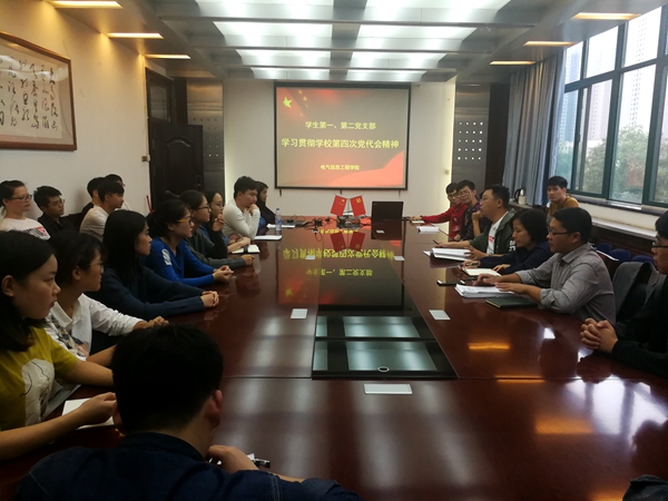 9月27日下午,电气信息工程学院在西二楼301会议室召开学习贯彻学校第四次党代会精神专题会,学院党总支副书记宋文军老师,分团委书记许海龙老师,学工办主任孔朋老师和学生第一、二支部全体党员参加会议。会议由孔朋老师主持。