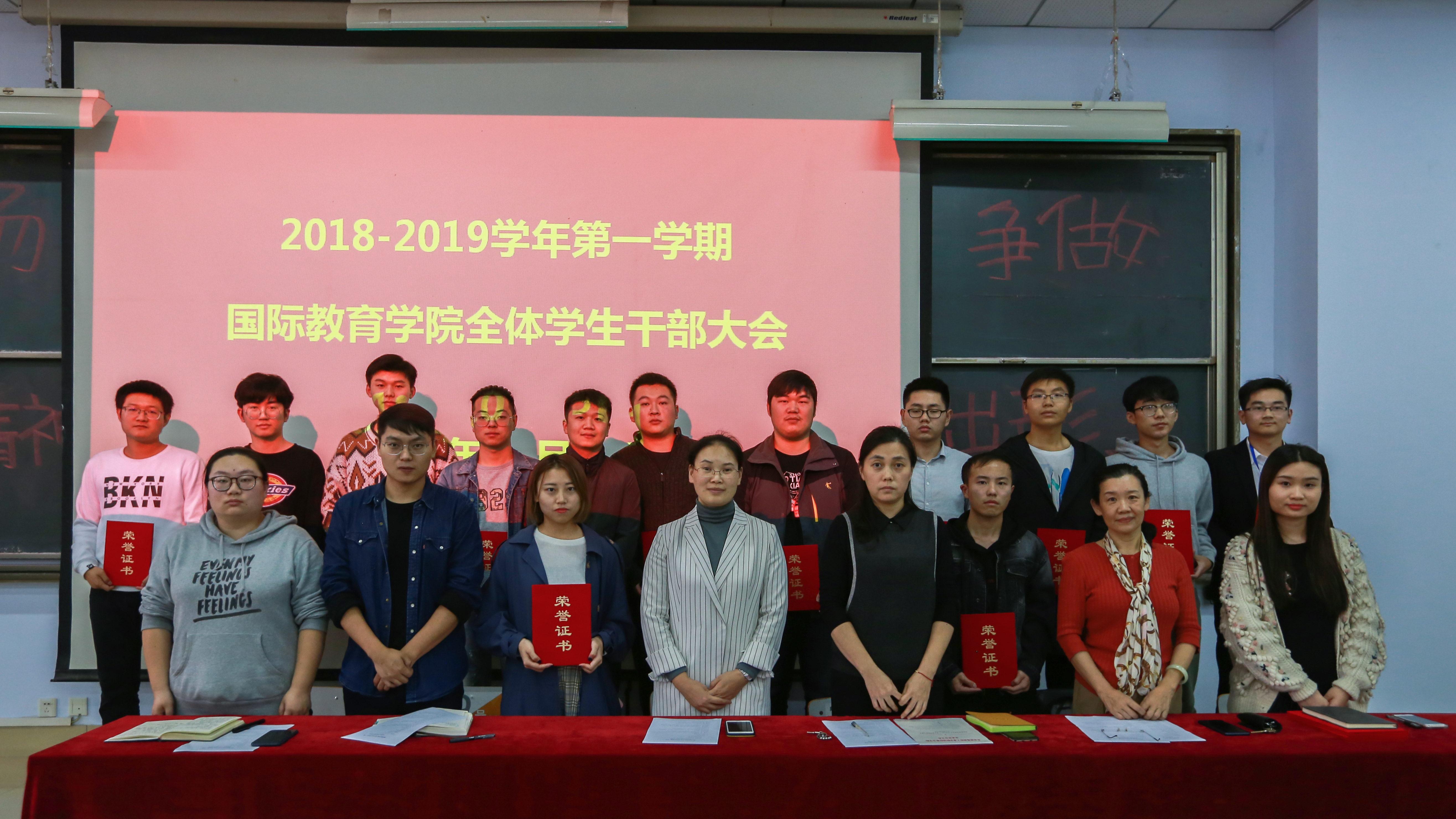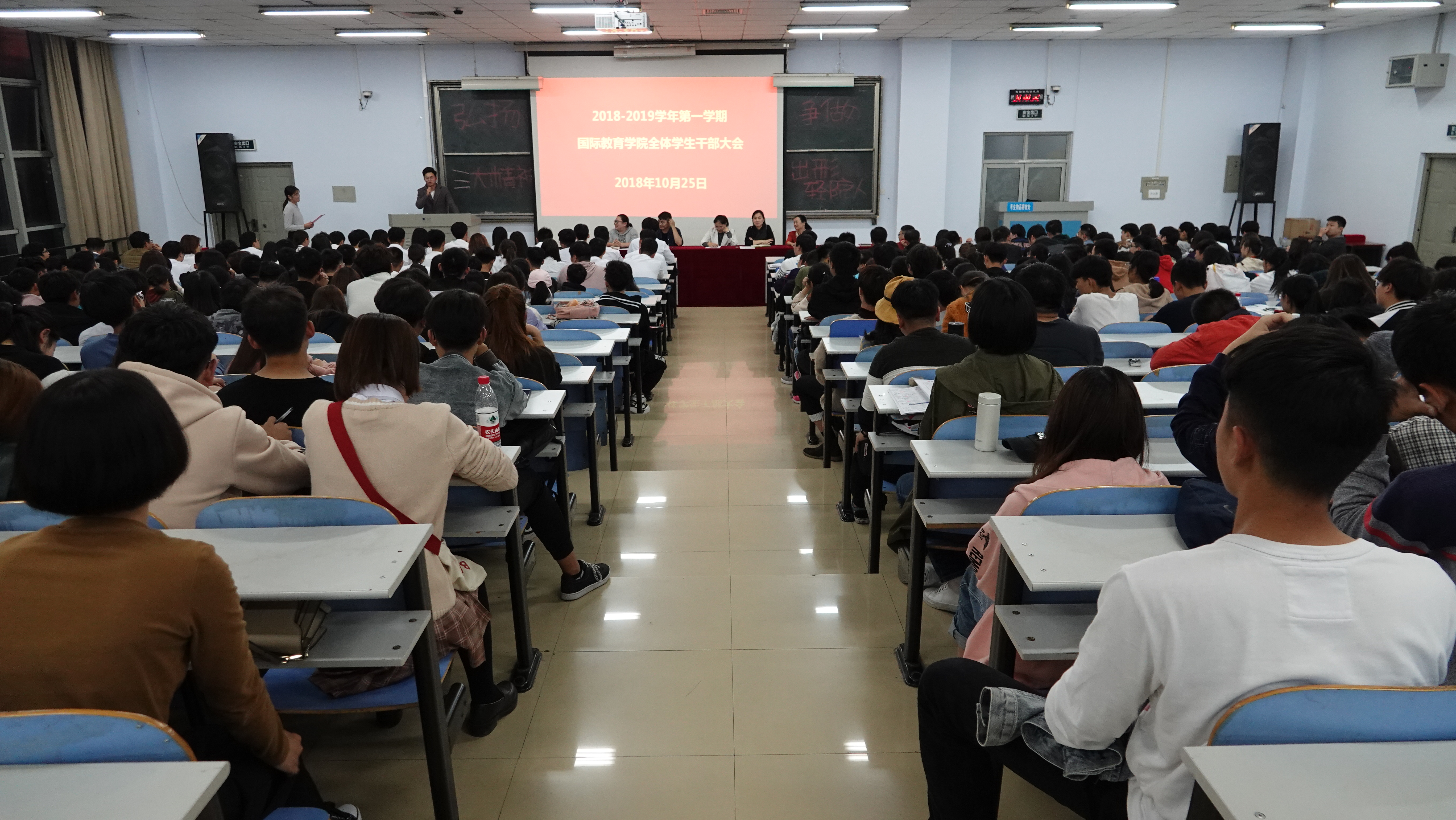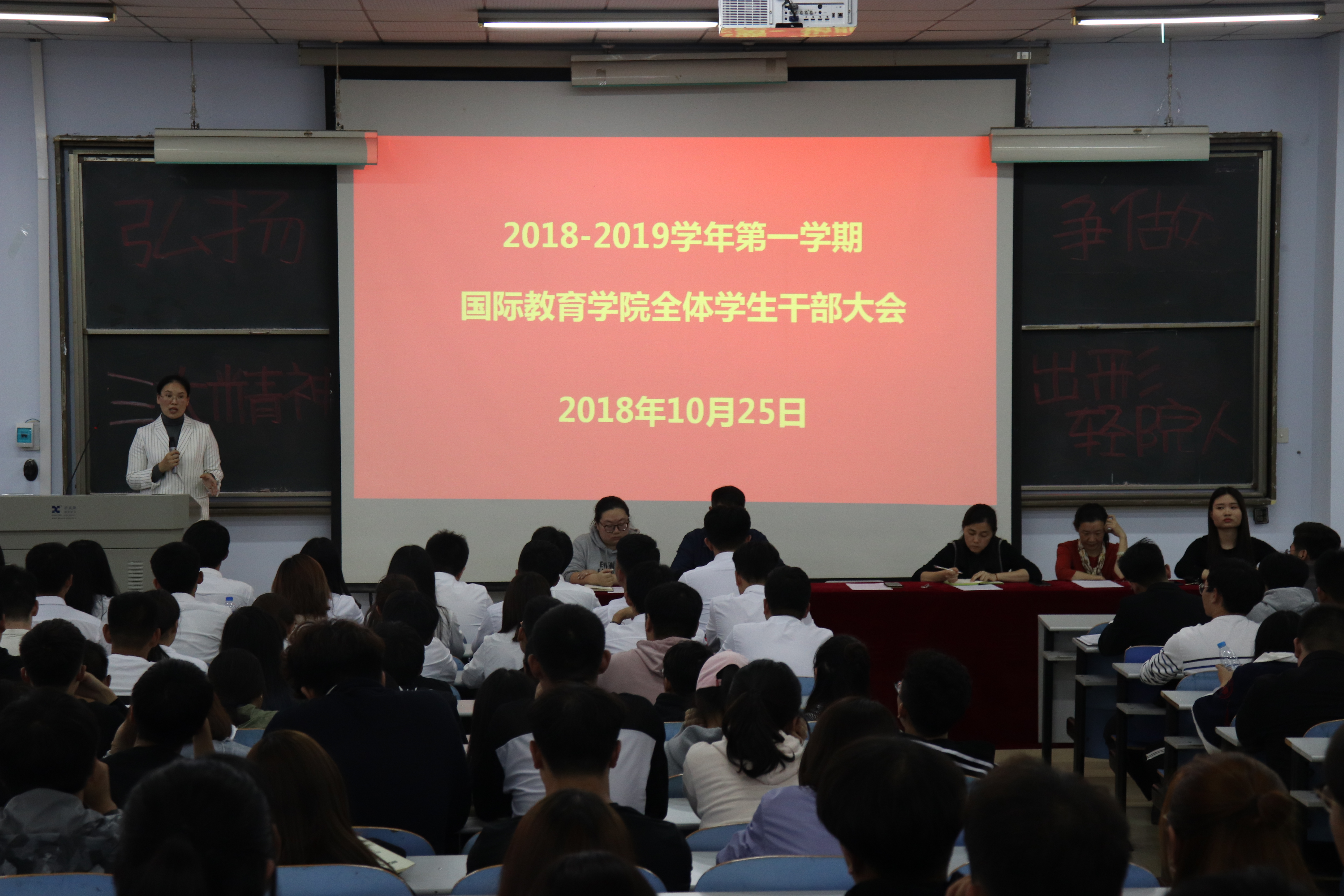 10月25日下午5:00,在教三楼302室,国际教育学院召开了“弘扬三大精神,争做出彩轻院人”全体学生干部大会,党总支副书记李锐杰老师、分团委书记张瑞凤老师、各专业辅导员老师及全体学生干部参加了本次会议。