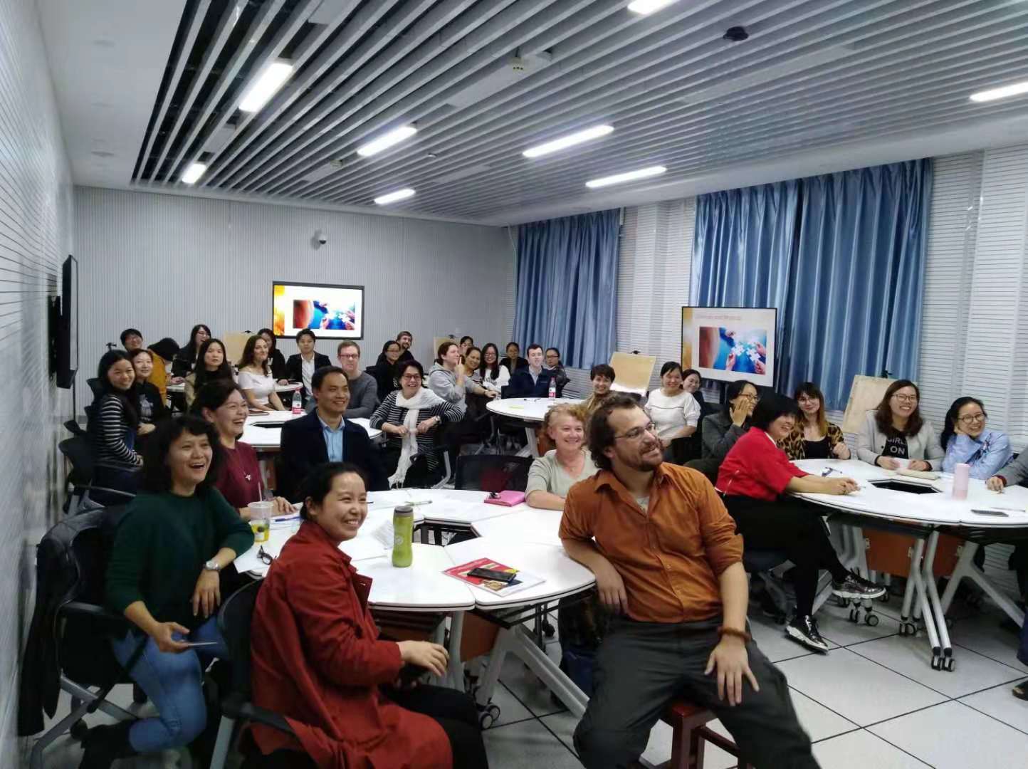 随后,中外教师分五组针对如何提高学生作业完成率、课堂上如何管理学生使用手机、如何鼓励后进生积极参与课堂活动、如何针对程度差异较大的班级设计教学等问题进行头脑风暴,探寻答案。之后各小组选派代表与所有老师分享了各自小组精彩的解决方案。