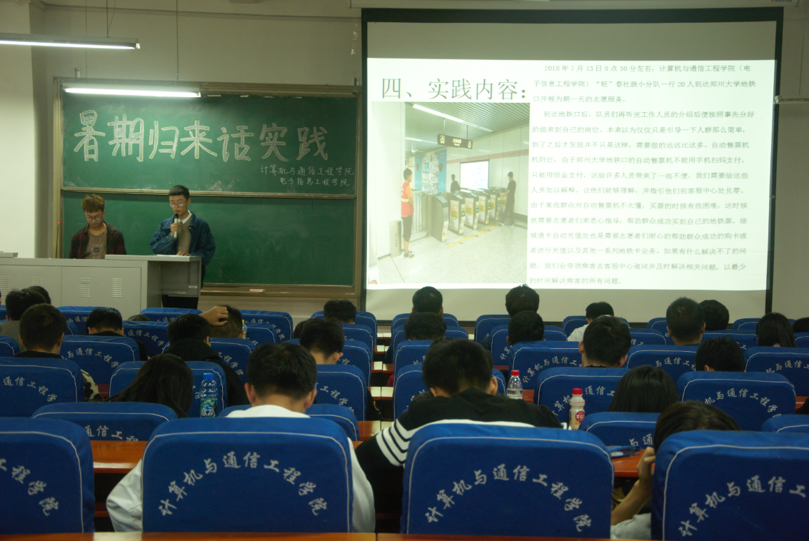 为激发学生们追求实践、自我锻炼的兴趣,使同学们在学业之余也能将实践拓展到自身。10月26日中午13点,计算机与通信工程学院(电子信息工程学院)在计算机楼217举办2018年暑期归来话实践暨社会实践表彰大会。我院分团委书记沈高峰、辅导员杜明明老师、刘晏男老师和马欣老师以及分团委全体成员、大一部分学生代表出席本次活动。