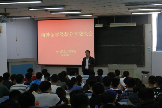为营造良好学习氛围,激励学生进一步深造学习,树立大学生学习楷模,充分发挥先进典型的示范引领作用。11月1日下午3:00,电气信息工程学院在教三楼102,举办留学经验交流会。经验交流会邀请了2015级肖晗、徐伟杰、李相朝、张裕荣4位同学分享他们出国学习的经验。党总支副书记宋文军老师、辅导员张曲遥老师及17、18级200余名学生代表参加了交流会。