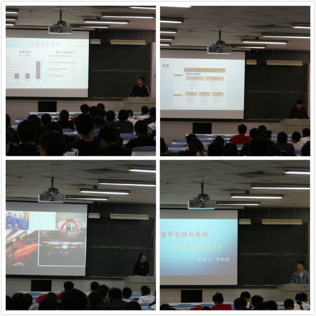 交流会伊始,肖晗、徐伟杰、李相朝、张裕荣以自己的留学契机为切入点,引出同学们现阶段在出国选择上存在的疑惑,引起同学们的广泛共鸣。接着,他们分别介绍了上一学年在美国奥克兰大学的学习与生活情况,谈到自身最大的收获,便是独立学习与生活能力的培养以及国际视野和知识的拓展。他们结合海外留学的经历,介绍了国外学习模式、语言适应等方面的经验,讲述了自己在国外留学生活的点点滴滴、分享了对国外文化、人际交往的切身体会,并针对同学们提出的问题一一进行耐心解答。
