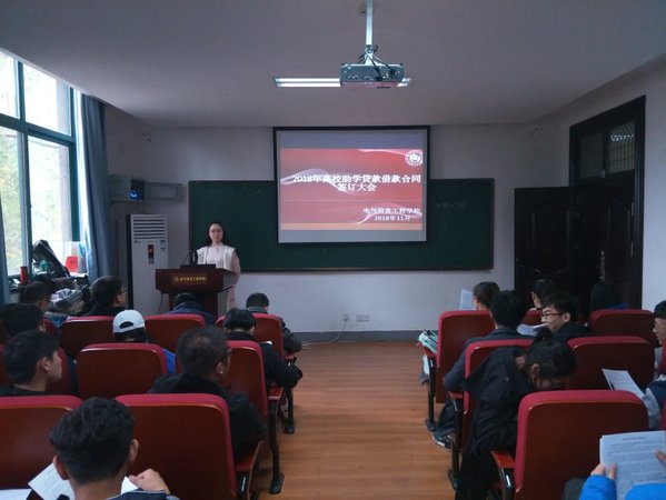 为保证我院高校贷款工作的顺利进行,增强同学们的诚信意识,2018年11月7日电气信息工程学院在西二楼202召开了2018年高校贷款合同签订大会。负责资助的李灏萱老师,学院全体贷款同学以及学生工作服务中心全体工作人员参加此次会议。