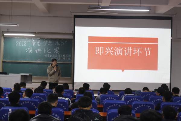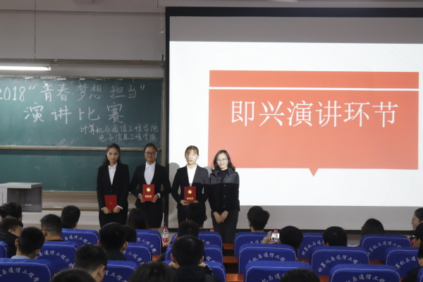 为了丰富同学们的课余生活,更好发掘同学们的口才能力,体现大学生朝气蓬勃的精神状态。11月15日晚19:30分,计算机与通信工程学院(电子信息工程学院)于计算机楼217教室举办纪念“一二·九”运动83周年系列之“青春 梦想 担当”演讲比赛。辅导员杜明明老师、欧阳杜鹃老师、马欣老师出席本次比赛,18级部分学生代表观看了本次比赛。