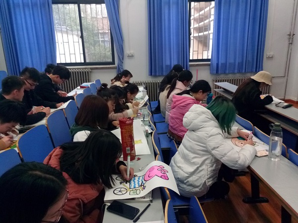 活动伊始,首先发给每位同学一张印有黑白线条画的素描纸或者一张白纸,让同学们在打印纸上填图自己喜欢的颜色,或者在白纸上画出自己心中所想,涂出自己所思。然后,组织者让学生们挨个谈了谈自己调图时的体会和感悟,并鼓励大家勇敢说出自己的想法,表达出真实感受。这样的活动不仅趣味而且放松,在这样的氛围下,同学们情绪都很舒缓,能够放松身心沉浸在自己的灵魂世界中。