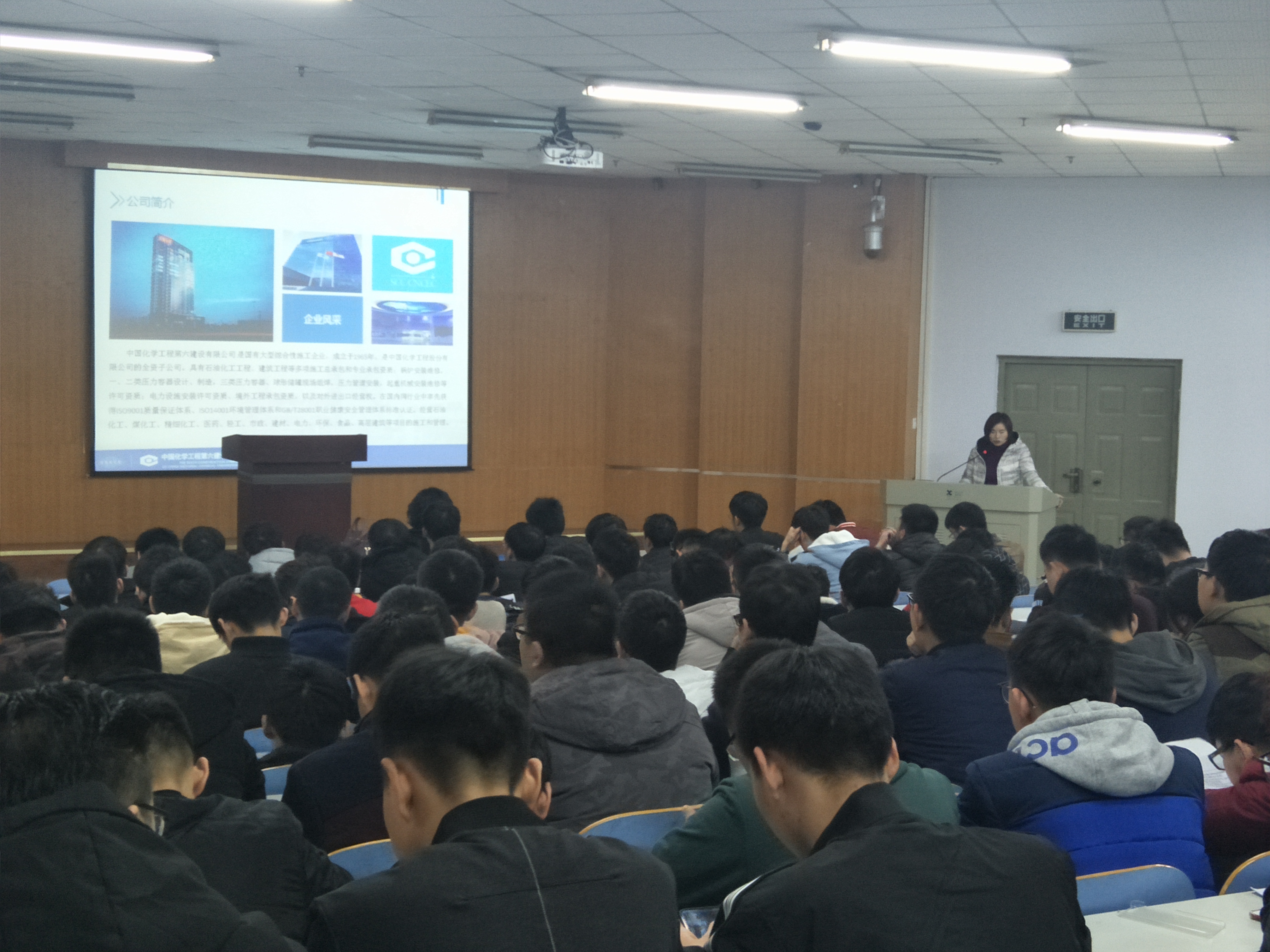 接着,中国化学工程第六建设有限公司人力专员杨女士结合多年工作经历,分享了人力资源管理和职业生涯规划相关经验,为同学们分析了就业形势和求职技巧。杨女士还播放了企业宣传视频,介绍中化六建发展历程、企业组织构成、企业文化、人才政策、福利待遇、晋升机制等,欢迎我院学生到中化六建实习、就业。会后,中化六建负责人还就简历设计、实习选择、求职技巧等对学生的问题进行一对一答疑。