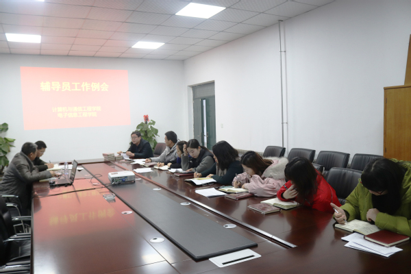 为进一步加强学生工作和辅导员队伍建设,交流工作经验,提高工作能力,有序推进期末各项工作的顺利开展,1月8日下午15:00,计算机与通信工程学院(电子信息工程学院)在学院楼226会议室,召开全体专兼职辅导员工作例会。会议由分团委书记沈高峰主持,全体专兼职辅导员参加此次会议。