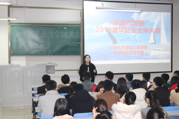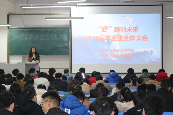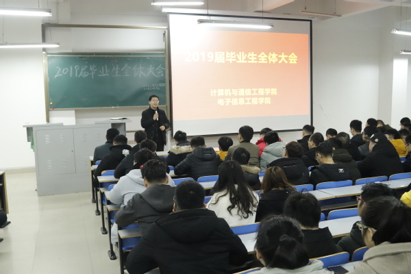 计算机与通信工程学院(电子信息工程学院)于2月26日上午9点至中午12点20在计算机楼118室召开2019届毕业生全体大会。学院分团委书记沈高峰、负责就业老师孟牒、各毕业班辅导员以及2019届全体毕业生900余人参加此次大会。