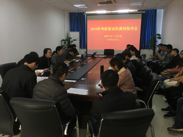 3月7日上午,物理与电子工程学院2019年研究生复试及调剂指导会在四教楼503会议室召开。学院院长苏玉玲、党总支副书记李玲、副院长杨坤、王永强、部分专业老师及2015级考研学生参加了会议。会议由党总支副书记李玲主持。