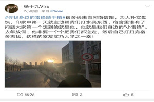 本次活动以“寻找身边的活雷锋”为主题,从自身经历、所见所感入手,以照片的形式记录下身边的好人好事,以发话题微博的形式进行。活动伊始,院团委发布“寻找身边的活雷锋”摄影征集通知,鼓励同学们拿起手机,拍摄下身边学雷锋助人为乐的好人好事瞬间,用镜头记录下同学们参加学雷锋志愿服务活动的情景。自通知发布起,同学们积极参与,纷纷发来图片,有本人学雷锋的活动记录,也有在公共场合偶遇的学雷锋好人好事。同学们用镜头记录下每一个令人感动的瞬间,有帮忙打水的舍友,也有悉心照顾受伤同学的活雷锋。同学们纷纷表示,此次活动受益匪浅,雷锋精神暖人心,虽然雷锋已离我们远去,但雷锋精神已融入日常生活,融入点滴小事,不断激励着一代又一代的人成长。