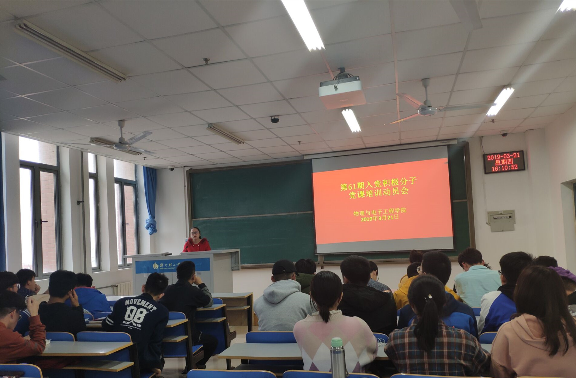为了强化入党积极分子教育,增强积极分子的党性修养,加强学生党支部队伍建设。3月21日下午,物理与电子工程学院在二教704教室召开了第61期入党积极分子党课培训动员会。负责党务工作的周芳华老师、学院30名本期党课培训班学员参加了会议。