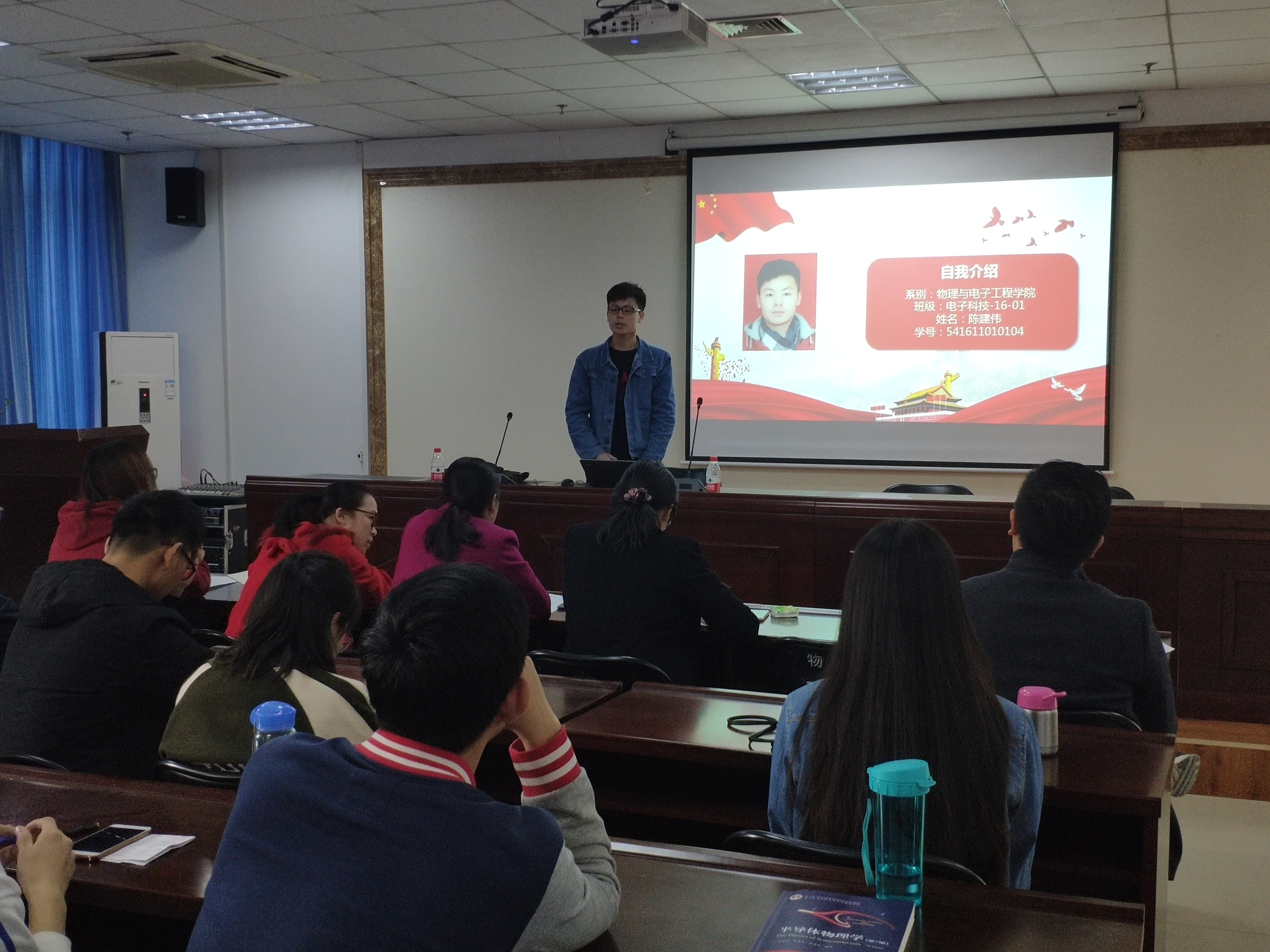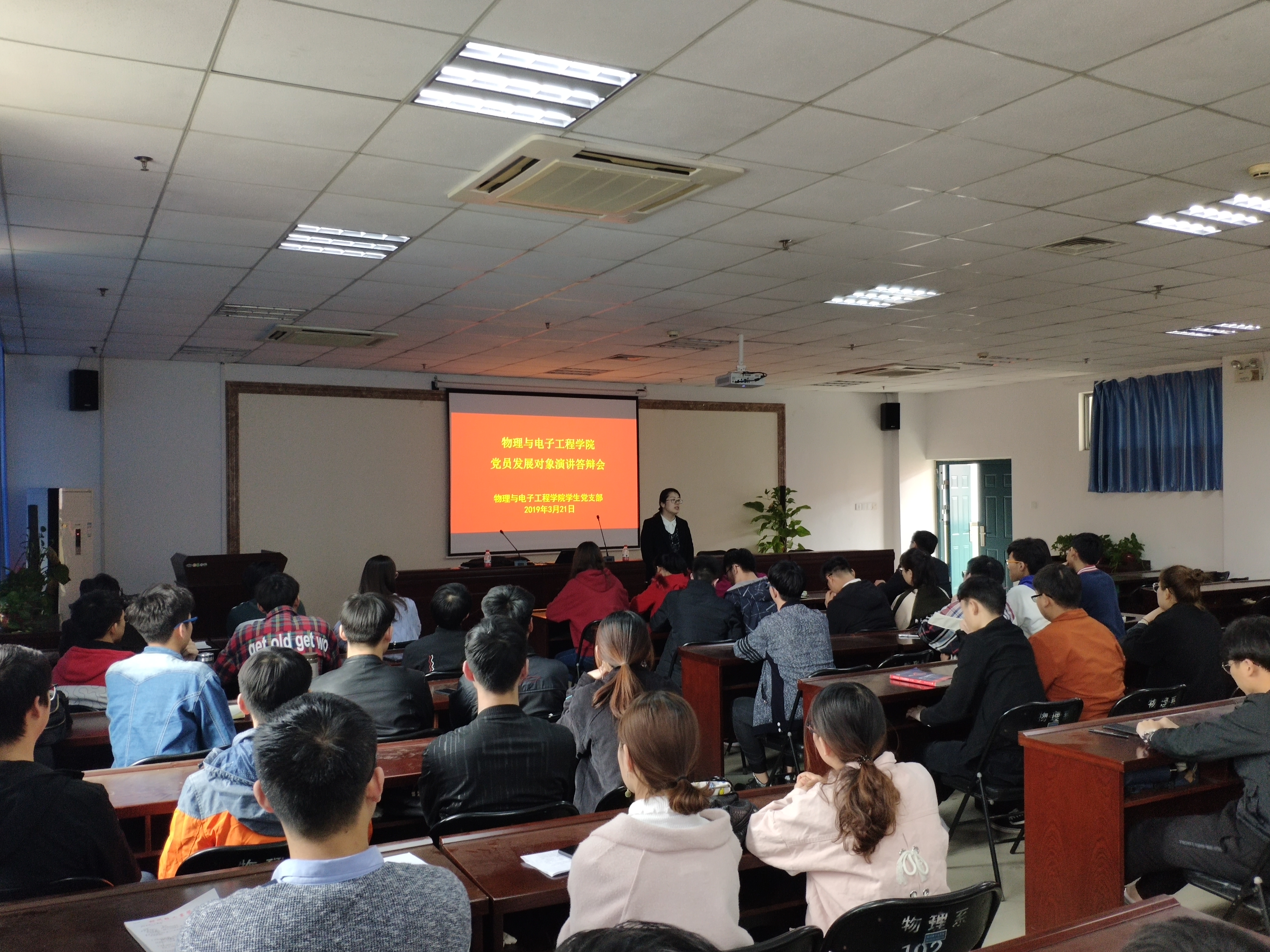 为了规范党员发展流程,促进党建工作标准化建设,切实提高学生党员发展质量。3月21日中午,物理与电子工程学院在四教楼503会议室举办了党员发展对象候选人演讲答辩会,学院党总支副书记李玲、分团委书记焦云娜、学生党支部书记周芳华、辅导员老师王冠玺、党员发展对象候选人、学生党员代表以及各班学生代表参加了此次演讲答辩会,评审由参会老师以及学生党支部委员担任。