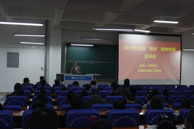 为深入学习贯彻落实全国两会精神,按照校党委宣传部有关工作安排,4月4日下午14:30,计算机与通信工程学院(电子信息工程学院)邀请校党委讲师团成员、马克思主义学院副院长杨晓博士在计算机学院217室,开展2019年全国“两会”精神专题宣讲会,学院全体教师及学生党员代表参加了宣讲会。宣讲会由学院党总支副书记王艳军主持。