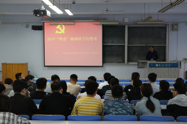为进一步加强研究生思想政治教育工作,推动“三全育人”工作深入开展,机电工程学院于2019年4月18日下午三点在东一楼200开展“导师讲堂”活动。此次讲堂的主题为“2019‘两会’精神学习与思考”,由机械电子工程系教工党支部书记费致根博士主讲,我院全体研究生参加了此次活动。