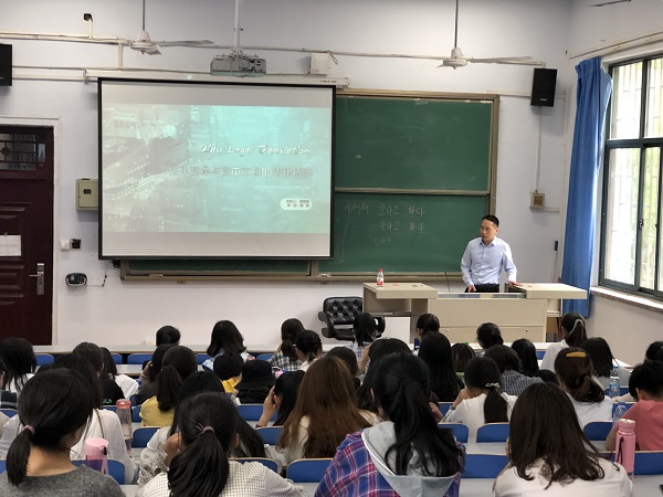 张国良校友分别从个人创业经验、翻译与商业实践和创新创业方向等三个方面,讲述了外语类学生在就业创业道路上的常见问题,鼓励同学们“年轻人敢闯更要敢创”,要以自信乐观、积极心态面对就业创业。围绕翻译法务行业发展,他以个人经历分享的方式,概述了翻译法务的发展趋势和人才需求,详细讲解了翻译与商业实践,使学生对外语应用行业现状、从业人员的日常工作、职业生涯发展等有了更清晰的认知。张国良先生从事法律翻译工作十多年,具有丰富的外语应用经验,他用山东正航和俏江南等案例向大家全方位地展示了法律翻译人员在资本市场的重要作用。讲座形象生动,深入浅出,实操性强,对同学们有很强的指导性和启发作用。