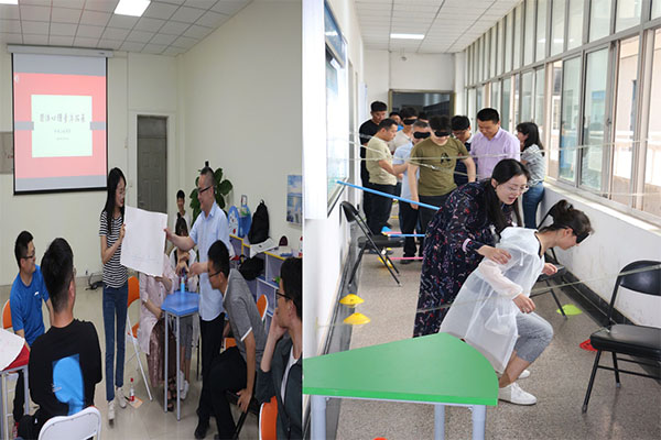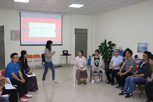 活动包括同舟共济、认识自己二十问、小组共做画、命运之牌、盲人之旅五个环节。“同舟共济”作为暖场活动,胡新月老师将班主任进行了分组,要求每组成员都要想办法共同站立在一块纸板上,通过团队协作增进彼此的熟悉程度;接下来“认识自己二十问”,通过二十个直面心灵的问题帮助组员认识自我、关注自我进而接纳自我;“小组共做画”通过组员共同创作一幅画,帮助老师体验人际关系,尤其是和学生相处中言语和非言语交流的重要性;“命运之牌”以再选命运的形式鼓励各位老师接纳自我,同时也提升班主任的同理心,从而设身处地的理解学生、帮助学生;“盲人之旅”增加了对他人的信任与接纳,倡导各位老师作为学生的“引路人”应积极建立师生之间信任,培养良好的师生关系。活动在一片欢声笑语中结束。