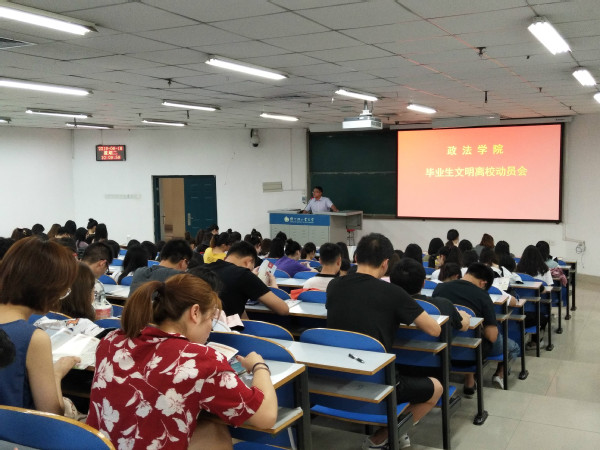 为了进一步做好毕业季文明离校工作,营造稳定和谐的校园氛围,政法学院于6月18日上午10:00在三教楼109室召开毕业生文明离校大会,党总支副书记许海龙及全体2019届毕业生参加。