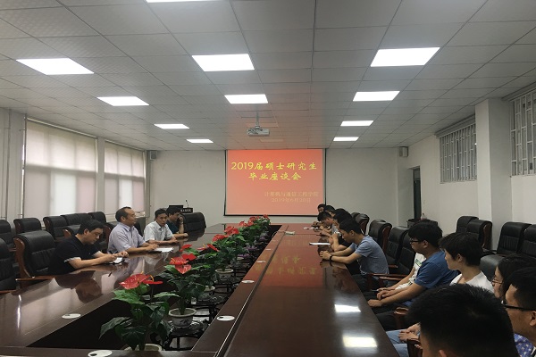 2019年6月20日,计算机与通信工程学院(电子信息工程学院)在计算机楼213召开了2019届硕士研究生毕业生座谈会。学院党总支书记黄道颖、院长金保华、副院长张素智、朱付保、导师代表尹毅峰出席了本次座谈会,并与2019届毕业研究生进行了亲切的交谈。