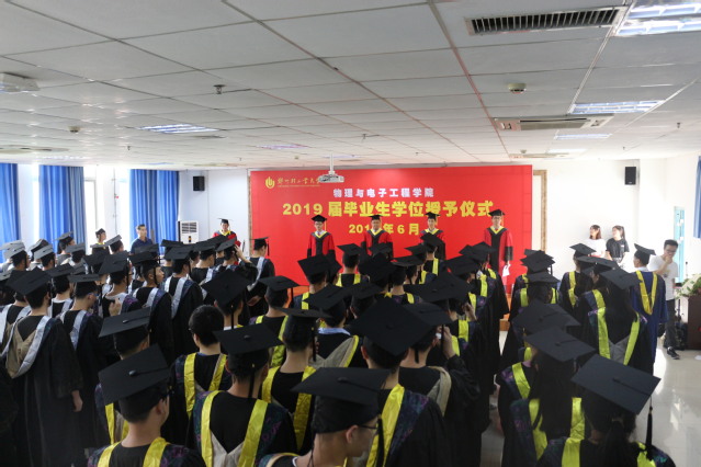 6月21日上午,物理与电子工程学院在科学校区四教楼503会议室隆重举办2019届毕业生学位授予仪式。学院党政领导班子、教师代表和2019届全体毕业生参加了此次活动。仪式由学院党总支副书记李玲主持。