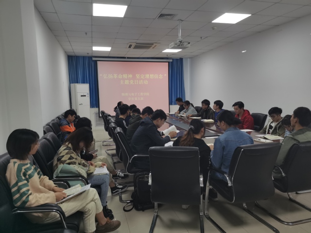 2019年10月28中午,物理与电子工程学院学生党支部在四教楼503会议室开展“弘扬革命精神 坚定理想信念”主题党日活动。党支部书记周芳华老师、20名学生党员参加了本次活动。