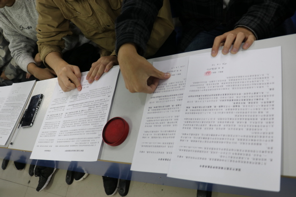 会议第二部分,韩老师就签订方法和注意事项说明后,由各班负责人向学生发放《国家开发银行高校助学贷款借款合同》和《助学贷款承诺书》,全体申请高校助学贷款学生在合同及承诺书上签字并按手印。