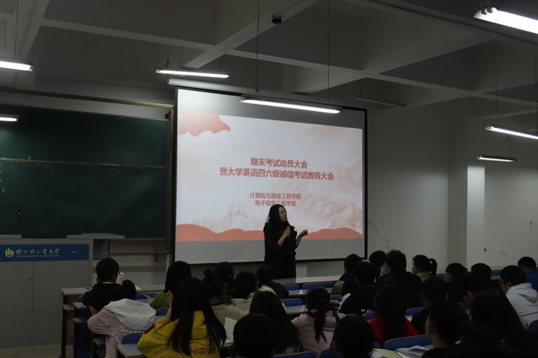 为了树立良好的道德风尚,严肃考纪考风,计算机与通信工程学院(电子信息工程学院)于12月12日中午在计算机楼118室召开期末考试动员大会暨大学英语四六级诚信考试教育大会。学工办主任孟牒老师、大一新生辅导员以及各年级班长、团支书、学生干部、党员和学生代表参加此次大会。