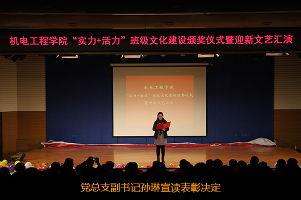 2019年12月19日晚上,机电工程学院在教一楼演讲厅举行了“实力+活力”班级文化建设颁奖仪式暨迎新文艺汇演,我院党总支副书记孙琳、分团委书记孔馨雨、辅导员、各年级学生参加了本次颁奖仪式。