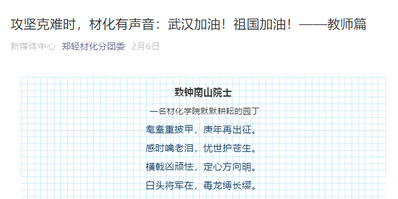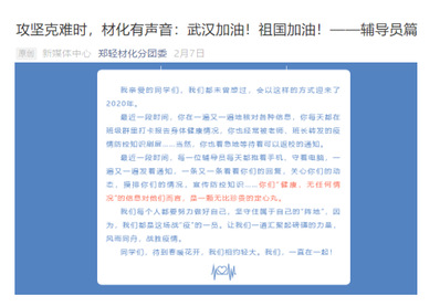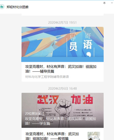 新冠肺炎疫情发生以来,牵动着全国人民的心。材料与化学工程学院开展“攻坚克难时,材化有声音:武汉加油!祖国加油!”线上送祝福活动,隔空送去最温馨的祝福,献上最美好的期盼。