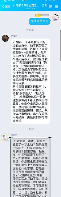 本次“学雷锋”主题系列团日活动内容丰富,形式多样,加深了学院团员青年对雷锋精神的理解,也激发了同学们学雷锋做好事的热情。其中材料物理1801团支部开展的“传承雷锋精神,致敬抗疫英雄”主题团日活动,活动通过观看电影《雷锋》回顾了雷锋的生平事迹,并结合观看疫情一线医护人员不畏牺牲、奋勇请战的感人视频向抗疫英雄们致敬,抗疫英雄们不怕牺牲、不畏艰难的优秀品质充分展示了新时代雷锋精神的弘扬与传承。电子科技1701团支部开展的“一部好电影,一本好故事,讲好一个真雷锋”主题团日活动,活动通过观看央视回忆录《人物》带领团支部成员学习了雷锋同志的先进事迹,选学了《见证人讲述——雷锋日记》部分内容,并通过线上转发“雷锋精神”相关文章弘扬雷锋精神。材料物理1701团支部开展的“学习雷锋---一份帮助,就是一份力量”主题团日活动,活动线上学习了雷锋同志的光荣事迹,随后通过线上打卡的方式,展示团员青年在疫情期间体力劳动或帮助他人的小事迹,以表达同学们对雷锋同志与当代雷锋人的深深敬意。