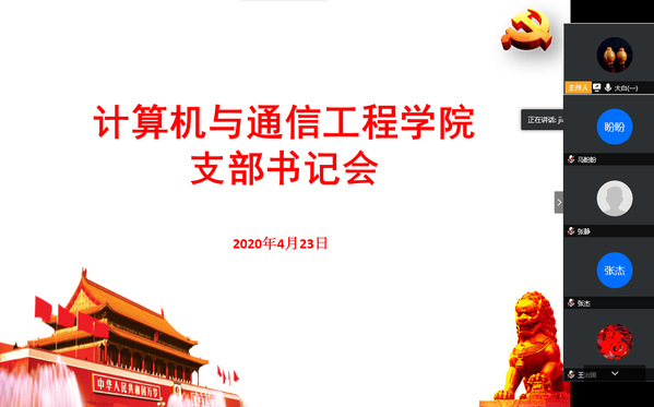 2020年4月23日,计算机与通信工程学院(电子信息工程学院)党委通过“腾讯会议”平台召开党支部书记大会。学院党委书记宋文军、院长金保华及各支部书记参加会议。会议由党委副书记王艳军主持。