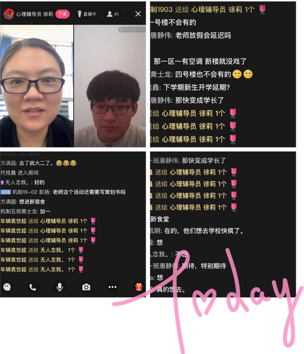 首先,徐老师针对疫情期间大家所做的心理健康教育工作给与了肯定,感谢大家能够主动对本班同学们的心理健康状况进行摸排,并积极传递人文关怀;接下来,徐老师对即将开展的以“蒲公英项目”为依托的心理健康教育工作进行了说明,本次心理健康工作活动主要采用线上形式,以复学前后心理调适为主题,结合我院专业特色或本班学生实际需求,以贴近学生生活实际进行申报,鼓励以自然班、宿舍为活动单位,重点是让学生在活动和实践中增强心理调适能力,通过人际支持激发内在力量,培育积极情感,实现在疫情中获得心理成长的目的,从而提升心理素质;最后,徐老师根据学生提出的问题进行了回答,并希望大家能够有效的利用好居家生活时间,调整好自己的情绪,人的情绪波动是自然现象,紧张焦虑等心理反应是疫情引起的正常人群的正常反应,不必过分在意;针对一些出现的负面情绪,徐老师建议大家,可以结合自身爱好,去读读书、听听音乐、做一些自己喜欢的体育锻炼等充实自己,或者也可以参照网络上的“放松训练”、“放松冥想”、“呼吸放松”等方法进行自我调节,分散注意力;也可以寻求亲朋好友帮助,与他们进行倾诉、发泄自己的不良情绪;若长时间处于不良情绪中,自我无法调整的,一定要及时寻求心理援助 。